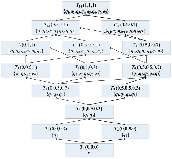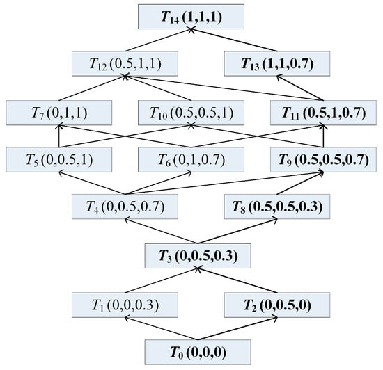 FC-states extend ordinary competence states by adding proficiency levels for each skill. Fuzzy skill learning is approximately continuous, while FC-states discretize it by selecting finite representative levels in . Based on these discretized values, we defined the fuzzy skill mapping, fuzzy competence structure, fuzzy competence space and CFCS above. It is also natural to use these selected values as thresholds to define the outer fringe of an FC-state. For example, in Example 1, , and is the next possible target proficiency after . The concept of the outer fringe of competence states can be extended to FC-states.