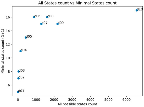 - Moderate pruning for small spaces. When is modest, a larger fraction of states may remain in the minimal chain, so the removed percentage is smaller (e.g., 44.444% for d01).