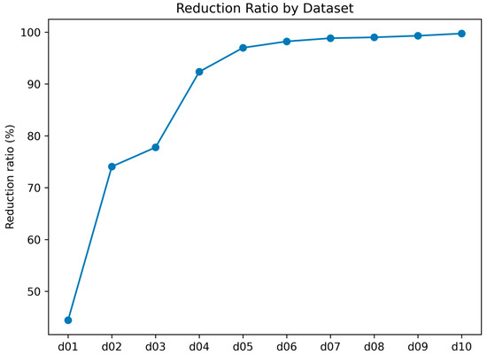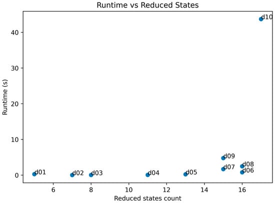 Figure 5 and Figure 6 together characterize Algorithm 3’s behavior: Figure 5 shows that the removed fraction increased with and rapidly approached 100% for large spaces (e.g., 99.74% for d10), because the reduced space contained only states while grew combinatorically. Figure 6 indicates runtime increased with dataset size and was dominated by the verification stage for large .