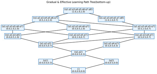 Most studies on learning path recommendation focus on the technical level and rarely incorporate the internal structure of learning content and learners’ mastery of existing knowledge. Knowledge space theory (KST) provides a theoretical framework for research on personalized learning path recommendation by integrating knowledge structures and learners’ knowledge states. KST, rooted in probabilistic measurement theory and mathematical psychology, is a mathematical framework proposed by Doignon and Falmagne to model and assess individuals’ knowledge states [20,21,22]. Using the formal mechanisms provided by KST, it is possible to infer an individual’s knowledge level in a specific domain based on their responses to a series of questions [23,24]. Currently, knowledge space theory has been extended to competence-based knowledge space theory (CbKST) [25,26,27,28]. Early research focusing on dichotomous knowledge structures has also been extended to polytomous knowledge structures [29,30,31,32,33]. At the same time, the combination of KST with cognitive diagnostic theory, rough set theory, formal concept analysis, and fuzzy set theory has further enriched KST and its applications [34,35,36,37,38]. Although early studies of KST also mentioned its application to learning path recommendation, relevant research has remained relatively limited. In recent years, some scholars have attempted to apply KST to learning path recommendation [39,40,41]. Zhou et al. explored learning path recommendation for fuzzy knowledge structures under conjunctive skill mappings, disjunctive skill mappings, and conjunctive fuzzy skill mappings [39]. Zhou et al. also studied the construction of knowledge structures and learning path recommendation in formal contexts [40]. Wang et al. proposed a learning path recommendation method based on fuzzy competence space theory, defined a fuzzy competence space called a consistent fuzzy competence space (CFCS), and designed a gradual and effective learning path recommendation algorithm from to the full set , which was validated through simulations [41].