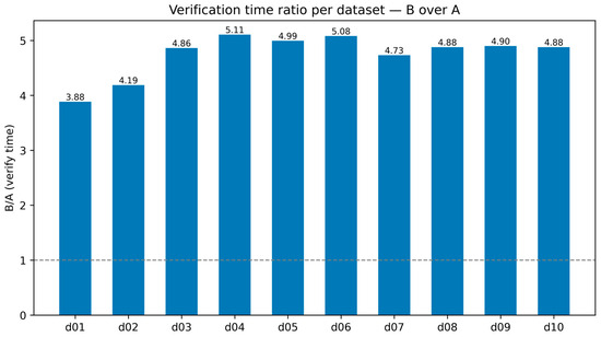Figure 8 plots, for each dataset, the verification-time ratio , which ranges from (d01) to 5.11 (d04), averaging about .