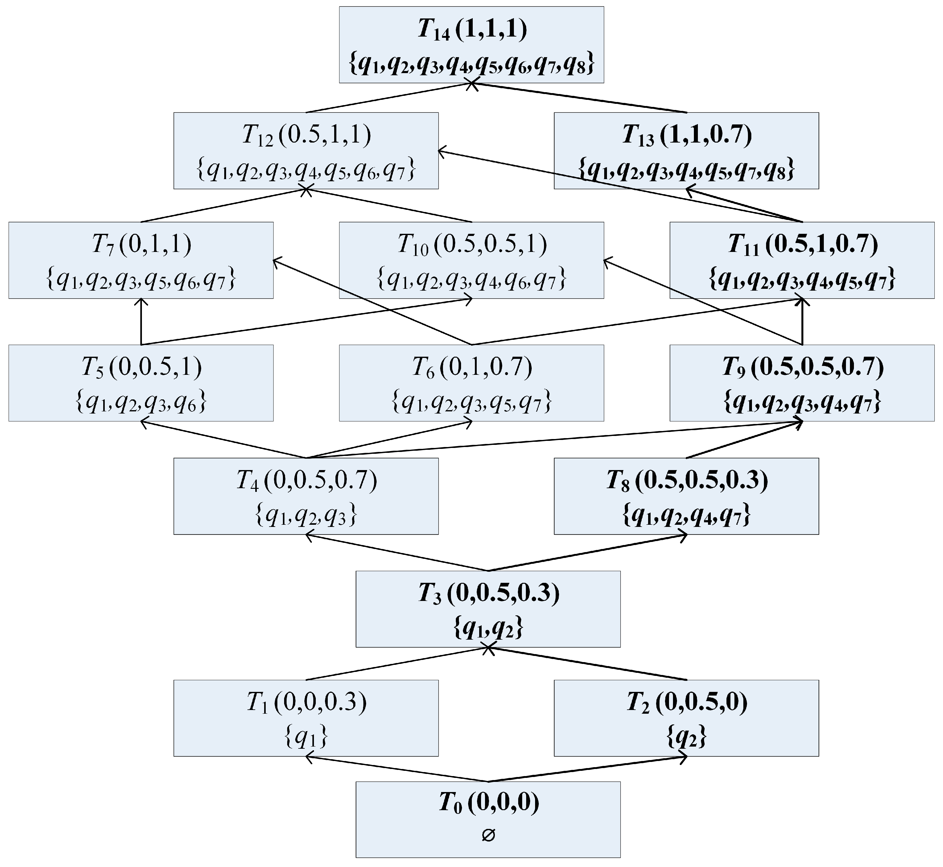 Example 5. Based on the fuzzy competence structure in Example 4, consider the sorted FC-states given in Table 6. Remove and from . It is straightforward to verify that the remaining FC-states still satisfy union-closure. Following Algorithm 1, we compute the outer fringes. As an illustration, we examine . Using the integer vectors in Table 6, we calculate the Manhattan distance between and for . The results are listed in Table 9. Since no state lies at distance from , we obtain = . Hence, despite union-closure, the modified is not a CFCS, and it is unnecessary to compute the outer fringes of the remaining states. We proceed to investigate the construction of CFCSs. As a starting point, we consider a special case in which contains all possible FC-states, i.e., .
