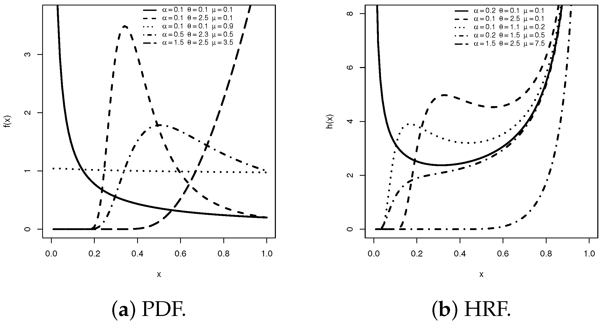 Figure 5) demonstrate a closer agreement between the empirical and theoretical distributions under the UGM model. Beyond these empirical findings, the UGM possesses a theoretical advantage: unlike most unit distributions, it can flexibly accommodate decreasing, increasing, bathtub-shaped, and inverted-bathtub-shaped hazard rate patterns.