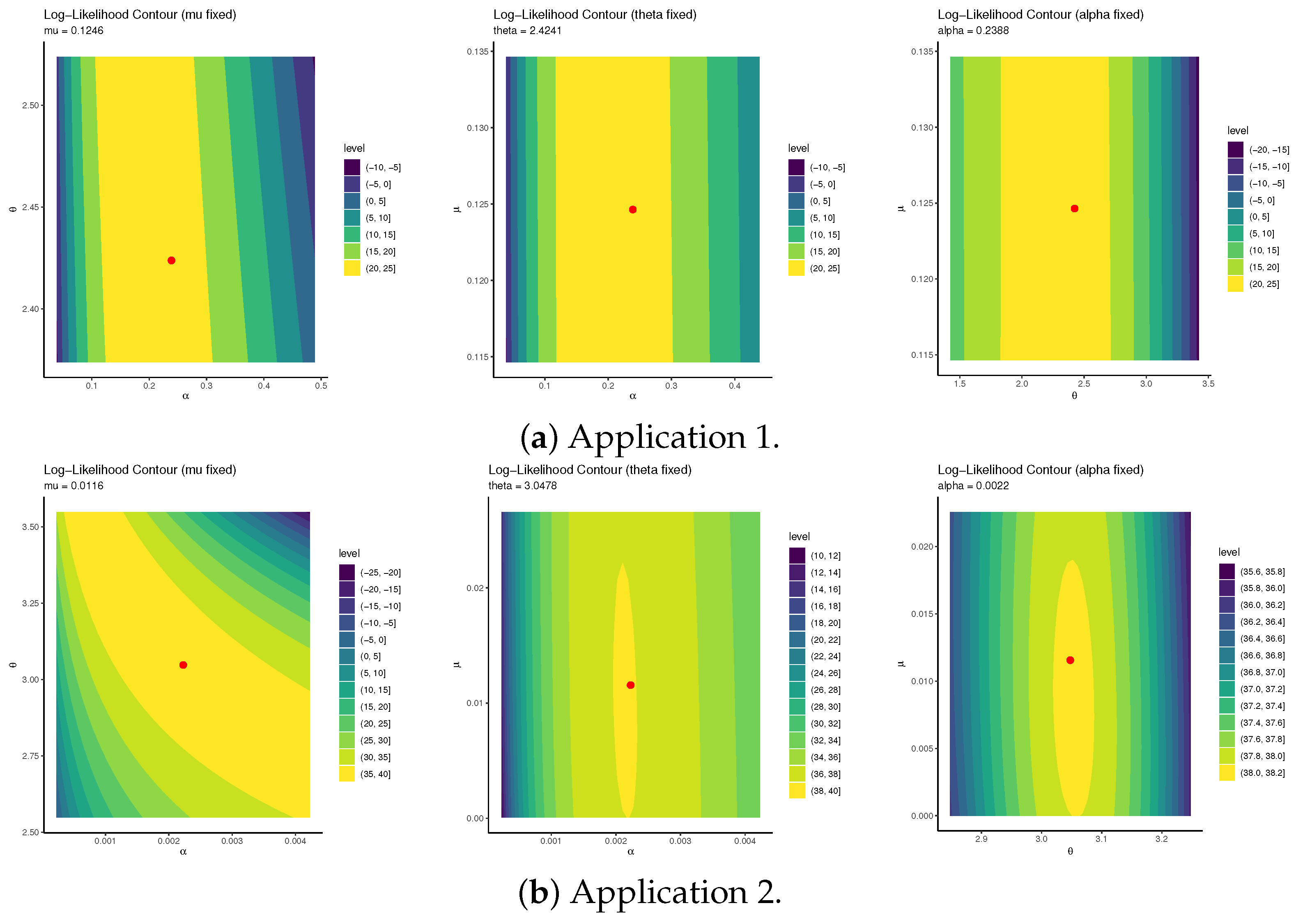of the UGM distribution for the proposed computational analysis based on the two real-world datasets in Applications 1 and 2, the contours of the log-likelihood function for these parameters are displayed in