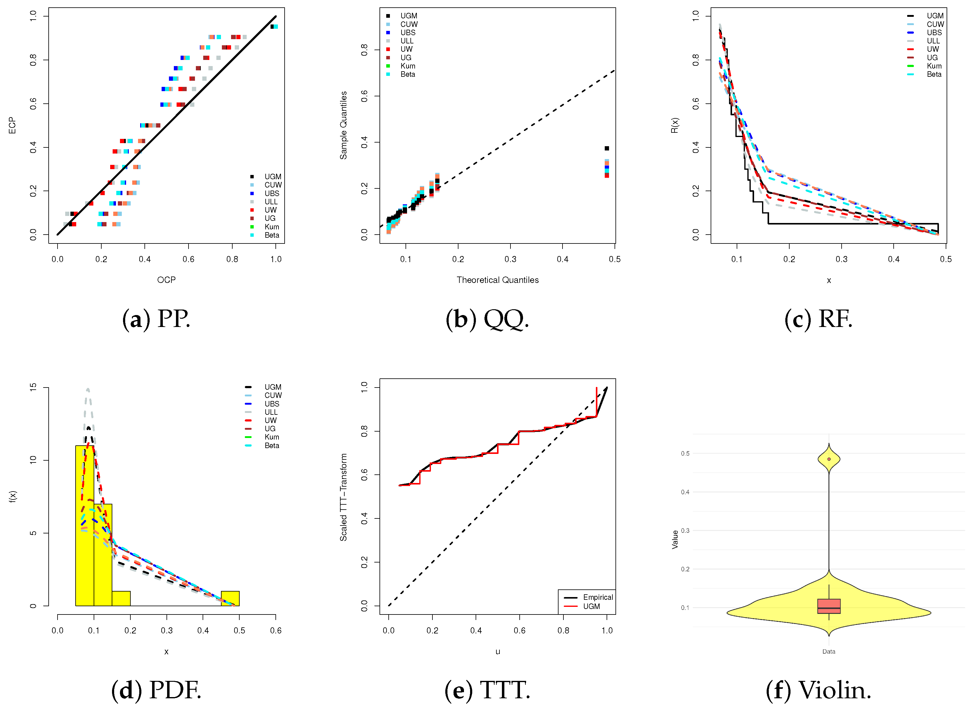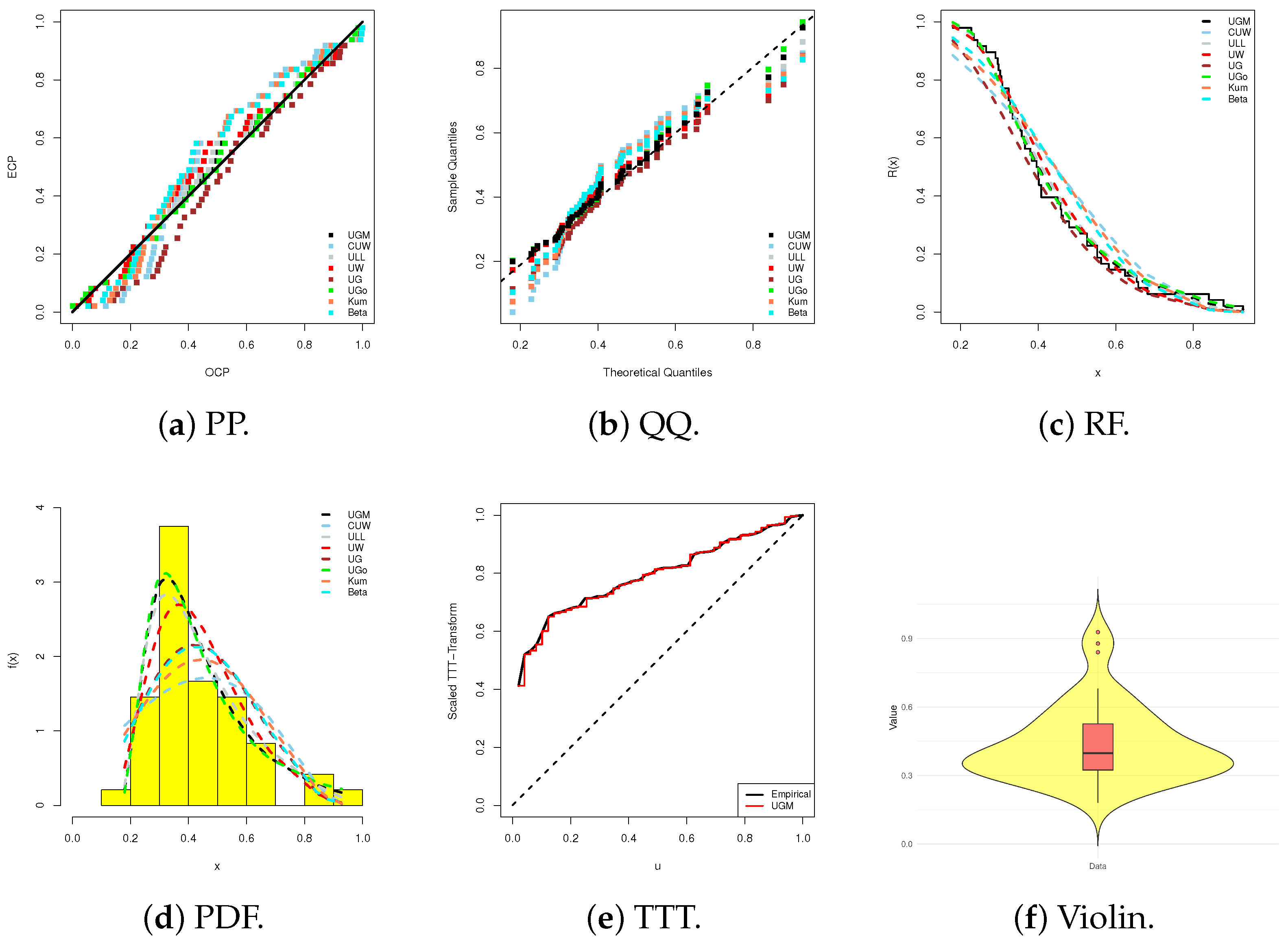 Figure 5 display the following: (i) probability–probability (PP) plots, (ii) quantile–quantile (QQ) plots, (iii) fitted RFs, (iv) fitted PDFs, (v) scale TTT-transform (TTT), and (vi) violin plots with boxplots.