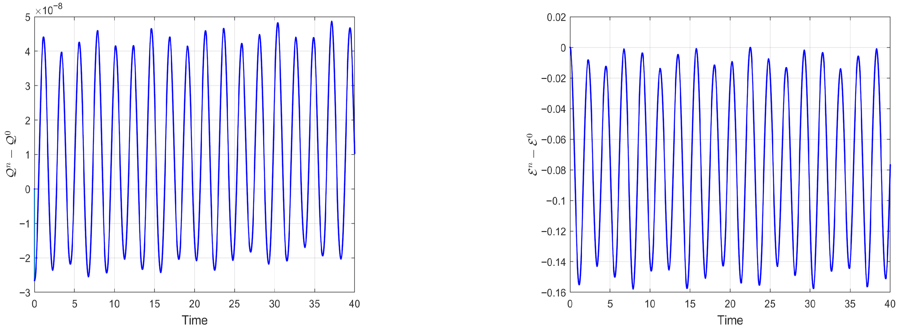 - The errors produced by both methods exhibit similar magnitudes when assessed under discrete norms. Specifically, under both the discrete -norm and -norm, the observed convergence rates are approximately second-order in time and fourth-order in space. These findings validate the theoretical accuracy established in Theorems 5 and 6.