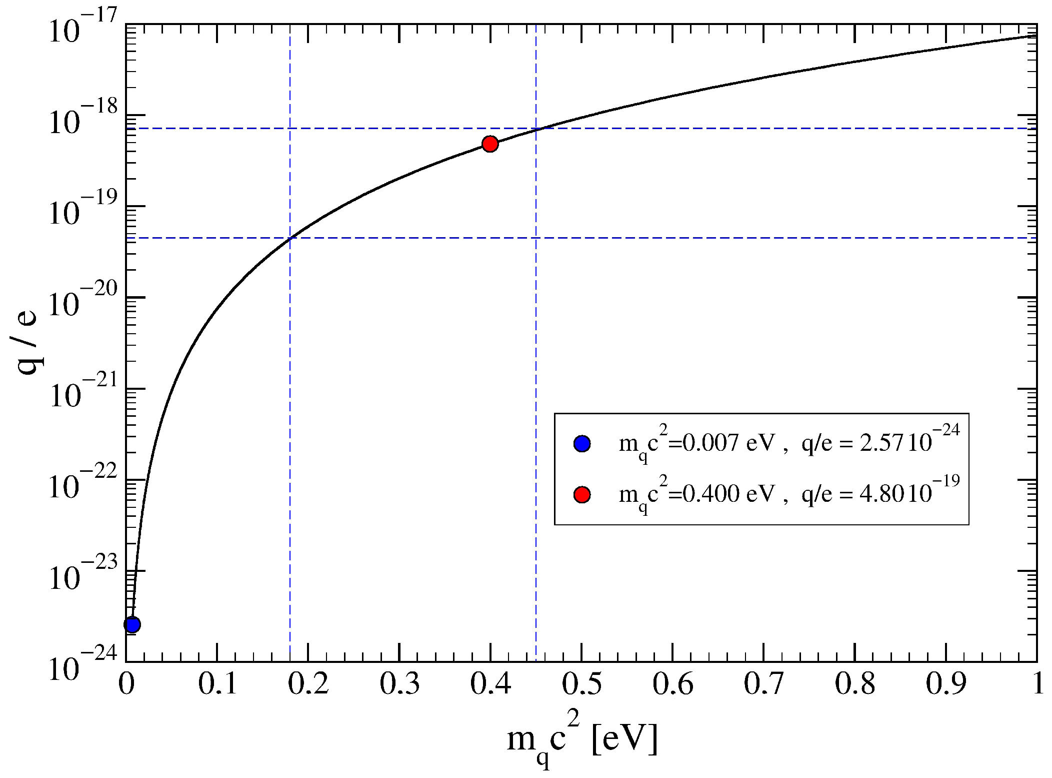 Figure 2. The ratio q / e of the neutrino charge q to the unit charge e vs. neutrino mass [eV]. In this plot, we have assumed the value γ = 2 . The blue circle corresponds to a mass m q c 2 = 0.007 eV yielding q / e 2.57   ·   10 24 . The red circle corresponds to a mass m q c 2 = 0.400 eV yielding q / e 4.80   ·   10 19 (cf. Figure 1). The rectangle enclosing the red circle, and delimited by the dashed lines, suggests conservative ranges for the possible physical values of the neutrino mass and charge. The vertical dashed lines correspond to the values m q c 2 = 0.18 eV (GERDA upper bound for a Majorana neutrino) and m q c 2 = 0.45 eV (KATRIN upper bound). The horizontal dashed lines, providing the associated range for the neutrino charge, are drawn to intersect the black continuous line.
