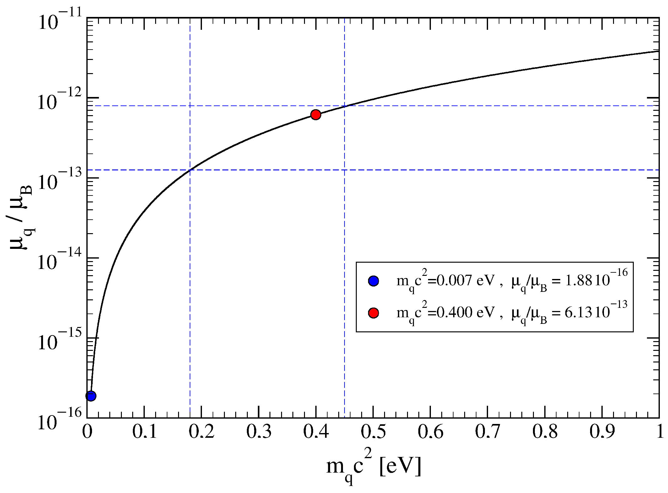 Figure 3. The neutrino magnetic moment, μ q / μ B , relative to the Bohr magneton, vs. neutrino mass [eV]. Also here the value γ = 2 has been assumed. The blue circle corresponds to a mass m q c 2 = 0.007 eV yielding μ q / μ B 1.88   ·   10 16 and the red circle to a mass m q c 2 = 0.400 eV yielding μ q / μ B 6.13   ·   10 13 . The meaning of the dashed lines is similar to the one in Figure 2, here providing non-rigorous bounds for the neutrino magnetic moment and mass.