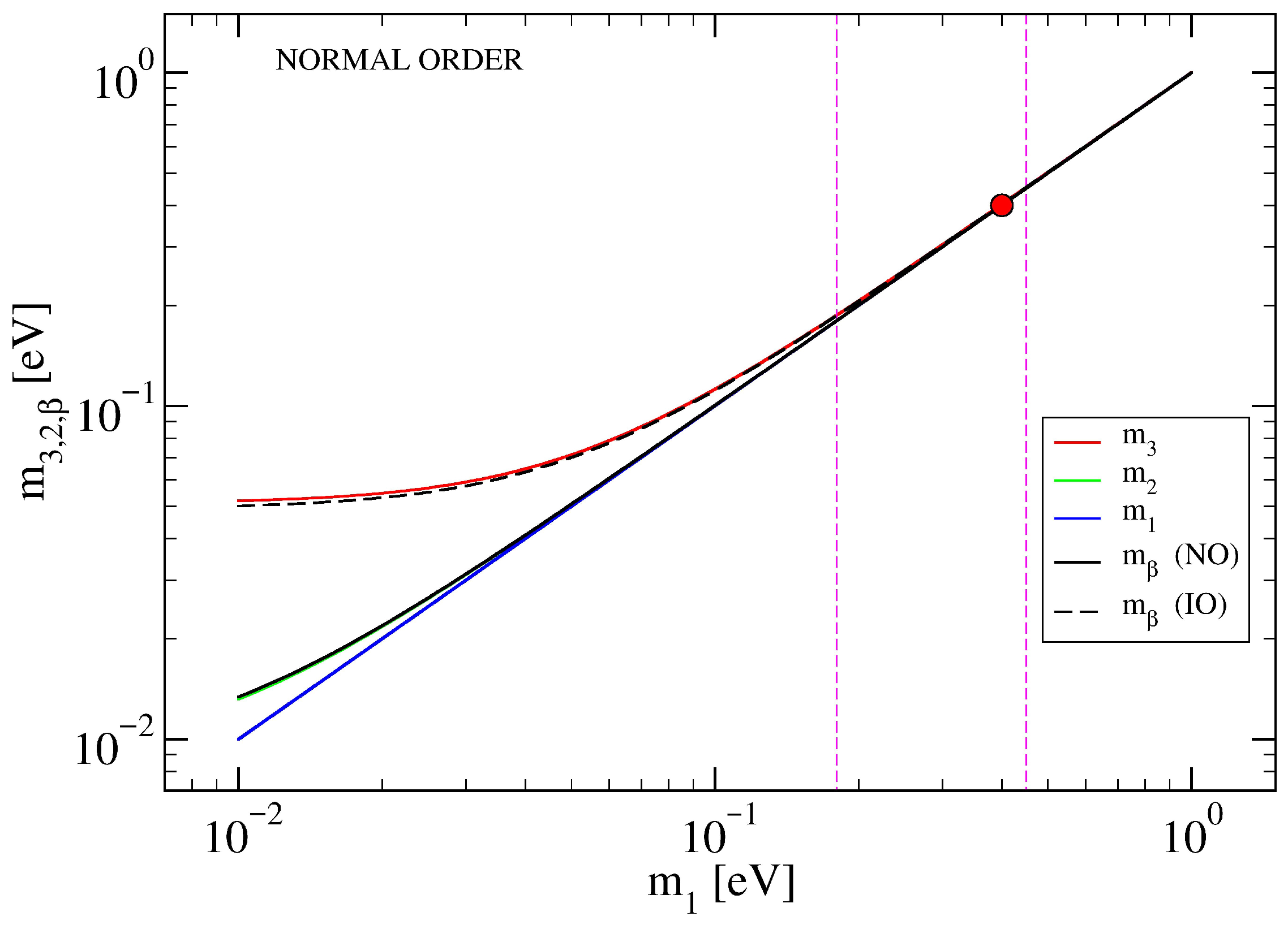 Figure A1. Normal order of the neutrino masses. Plotted are m 3 (red line), m 2 (green line), m 1 (blue line) vs m 1 . The effective electron neutrino mass, m β (black line), almost coincides with m 2 (green line). For comparison, the values of m β (IO) are shown by the dashed black line. The vertical dashed lines correspond to the values m 1 = 0.18 eV (GERDA upper bound for a Majorana neutrino) and m 1 = 0.45 eV (KATRIN upper bound), and are drawn as a guide. The red circle corresponds to m 1 = 0.4 eV. The numerical results are available upon request.