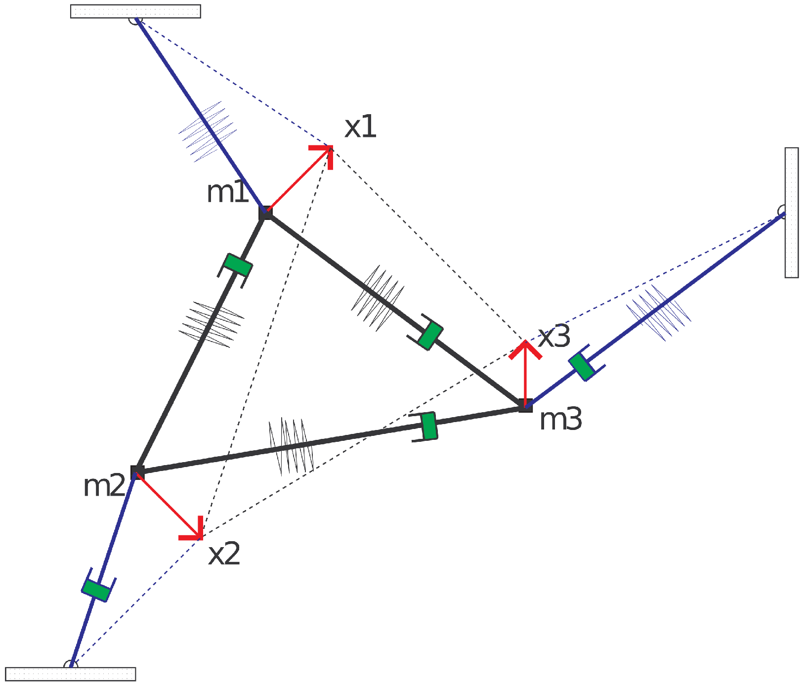 Let denote the matrix whenever masses and are connected by a spring with stiffness . We shall use the diagonal element to denote the stiffness of a spring attached solely by the mass to a fixed end but not others. Likewise, let be matrix recording damper linkages. In a sense, both matrices can be considered as adjacency matrices. For each mass , let denote the set of masses linked to by a spring and the set of masses linked to by a damper. We may also assume that the mass is attached to a set of fixed rotational joints at with spring stiffness and damping , . If , then is a free end.