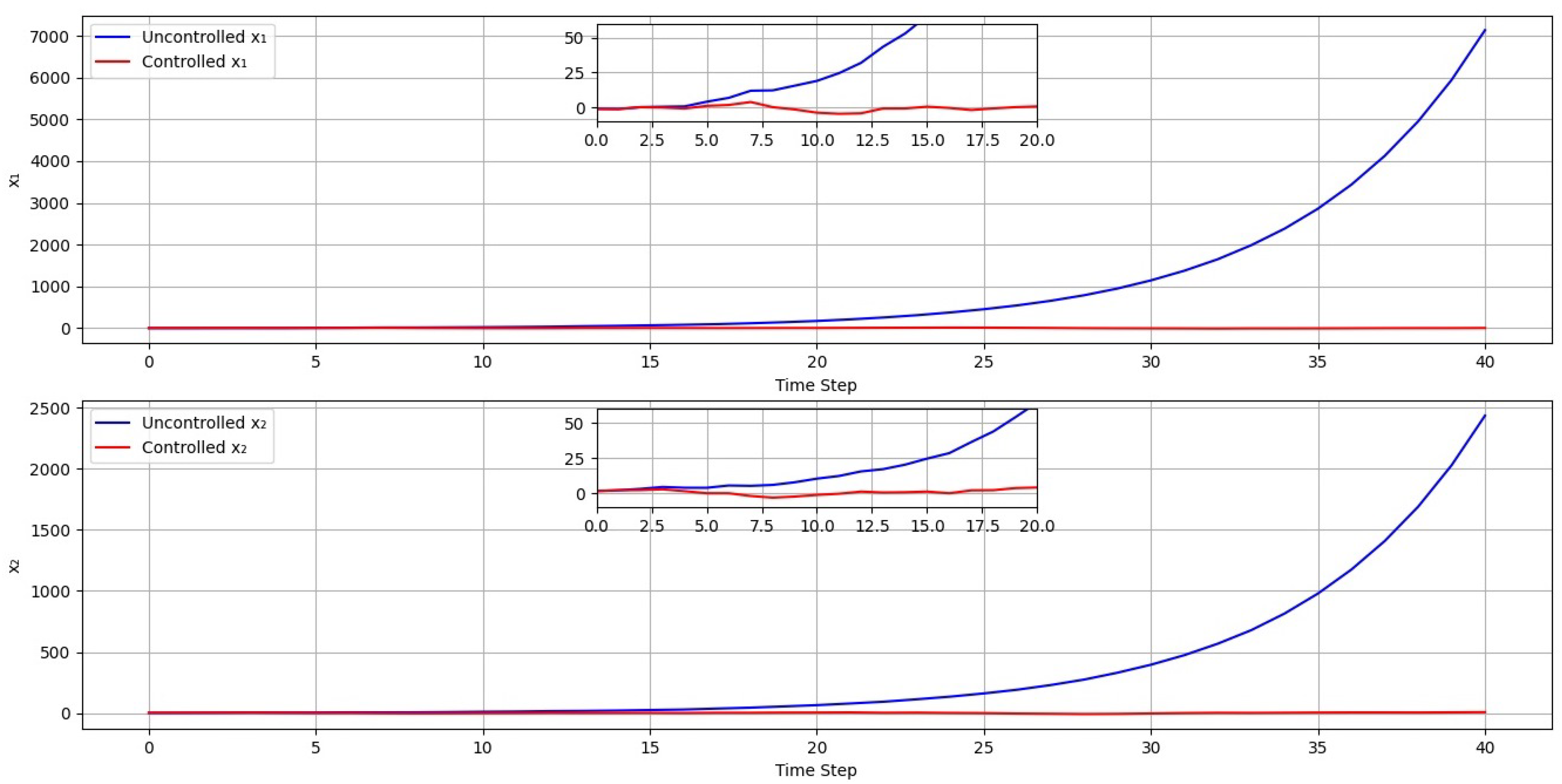 Remark 2. The optimal feedback controller for the separated control problem is given by Theorem 1 in [5]; it indicates that there exists a separation principle if the policy satisfies the structure of Equation (4) in [5]. In this paper, Equation (23a) is exactly the same as the structure of Equation (4) in [5], which shows that the optimal control strategy proposed by us satisfies the separation principle. Remark 3. The problem of designing a controller based on the filter requires the consideration of both filtering performance and control performance simultaneously. One typical method is to prioritize filtering performance before ensuring control performance. For example, the separation structure between the controller and the quantizer is studied in [18] to ensure the filtering performance and control performance individually. Through a similar analytical approach, we find that the state estimation error at the filter depends only on the energy selection policy through the variable and not on the control . Likewise, we obtain a separation principle between the energy selector and the controller. Note that, in contrast to [