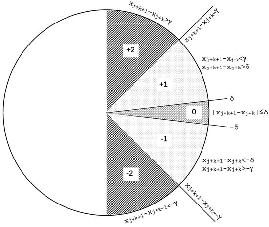 - If , 0 is the symbol to be assigned to the current active symbolic string position, . This is the case when, depending on threshold , two consecutive values are very similar, which could be the case for ties [76].