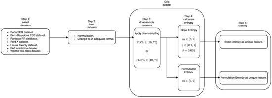 The experiments were devised to assess how SlpEn can benefit in terms of accuracy in classification tasks from the pattern reinforcement provided by processing the temporal series under analysis with TS. In addition, the same experiments carried out for SlpEn have also been implemented with PE, not only for comparison purposes, but also to show that TS can be beneficial for any kind of entropy whenever used in classification tasks. Figure 2 depicts a flow diagram of the conducted experiments, detailing step by step how they have been executed. Moreover, we performed again the experiments substituting TS with UDS in order to asses how uniform dowsampling performs in combination with entropy calculation.