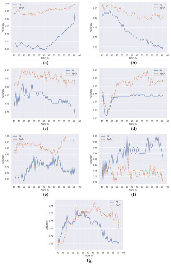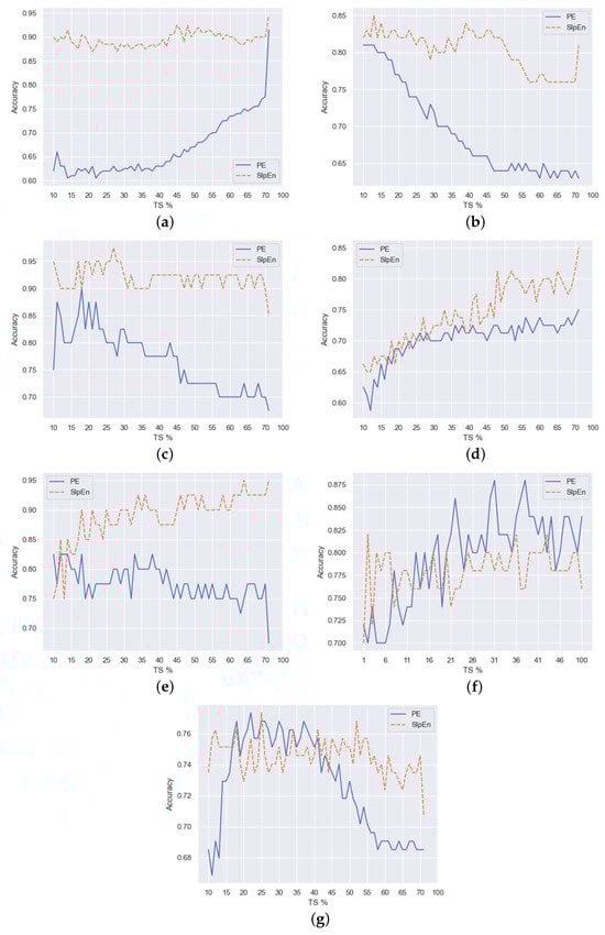 Classification accuracy is the main measure used to assess the performance of the methods tested. Additionally, we also used speed improvements, as mentioned previously. That accuracy corresponds to the percentage of correctly classified time series based on TS/UDS+SlpEn, SlpEn, TS/UDS+PE or PE as features individually, for each one of the seven experimental datasets found in the benchmark [28,88].