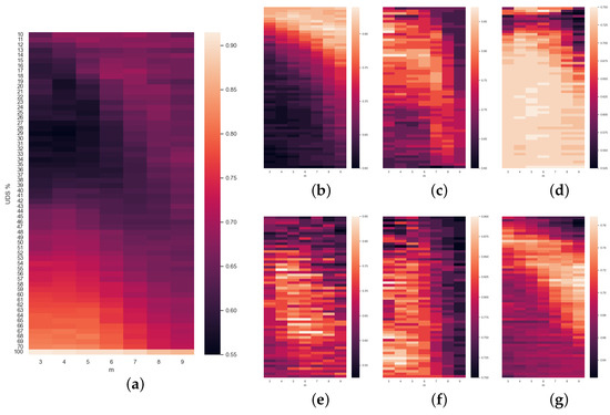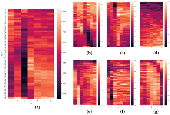 Heatmap representing accuracy levels of SlpEn. The brighter the colour, the higher the accuracy. Each row represents the percentage of the samples from the temporal sequence extracted using UDS. Bottom row corresponds to the original sequence with no downsampling. The columns refer to different values of m. Images illustrate behaviour of each one of the datasets: (a) Bonn EEG, (b) Bern-Barcelona, (c) Fantasia, (d) Ford A, (e) House Twenty, (f) PAF prediction, (g) Worms two-class.