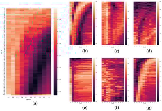 Heatmap representing accuracy levels of SlpEn. The brighter the colour, the higher the accuracy. Each row represents the percentage of the samples from the temporal sequence extracted using UDS. Bottom row corresponds to the original sequence with no downsampling. The columns refer to different values of . Images illustrate behaviour of each one of the datasets: (a) Bonn EEG, (b) Bern-Barcelona, (c) Fantasia, (d) Ford A, (e) House Twenty, (f) PAF prediction, (g) Worms two-class.