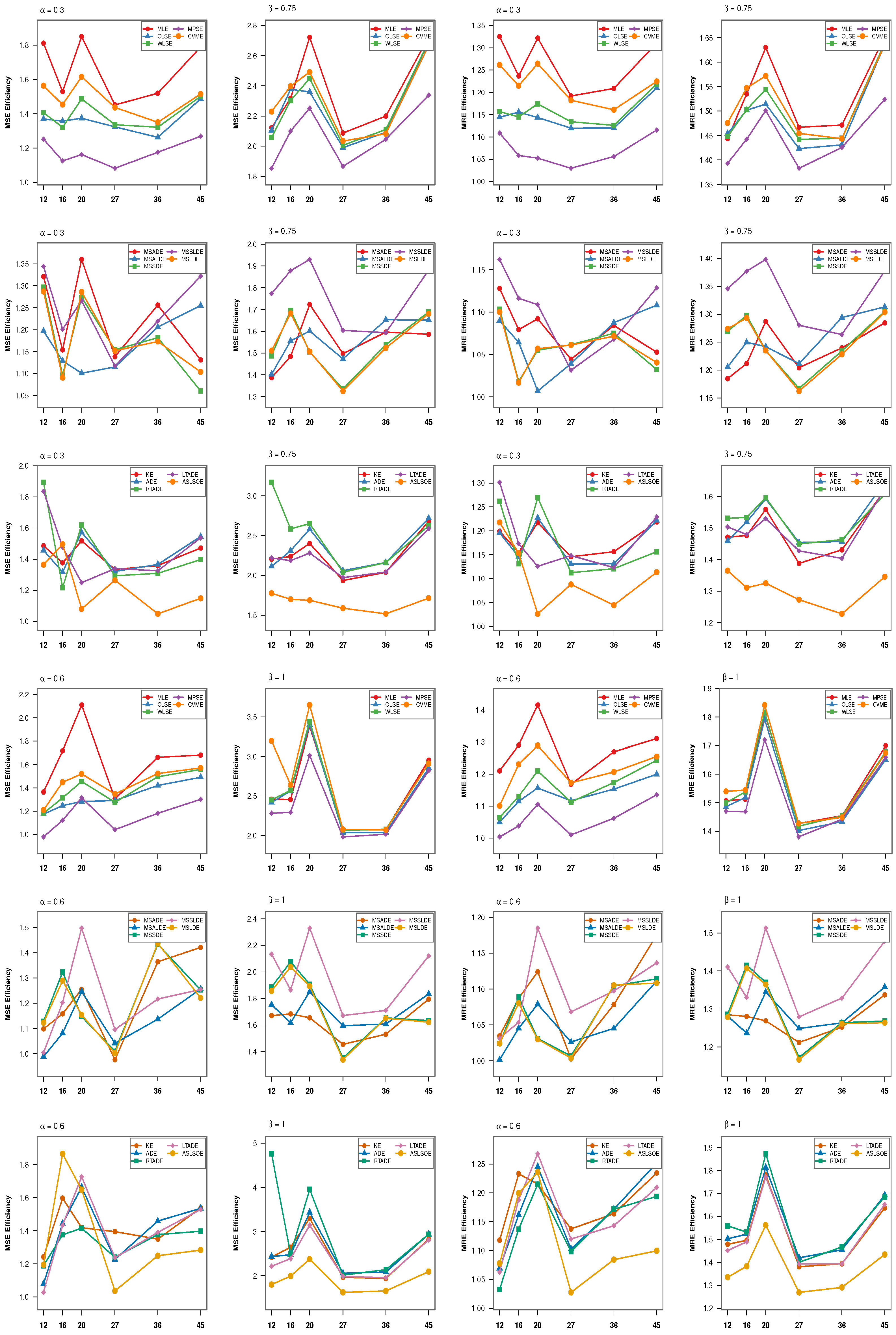 Figure 2, we plotted the efficiency values based on the RSS relative to SRS for the MSE and MRE using all estimation methods with different sample sizes for easy comparison.