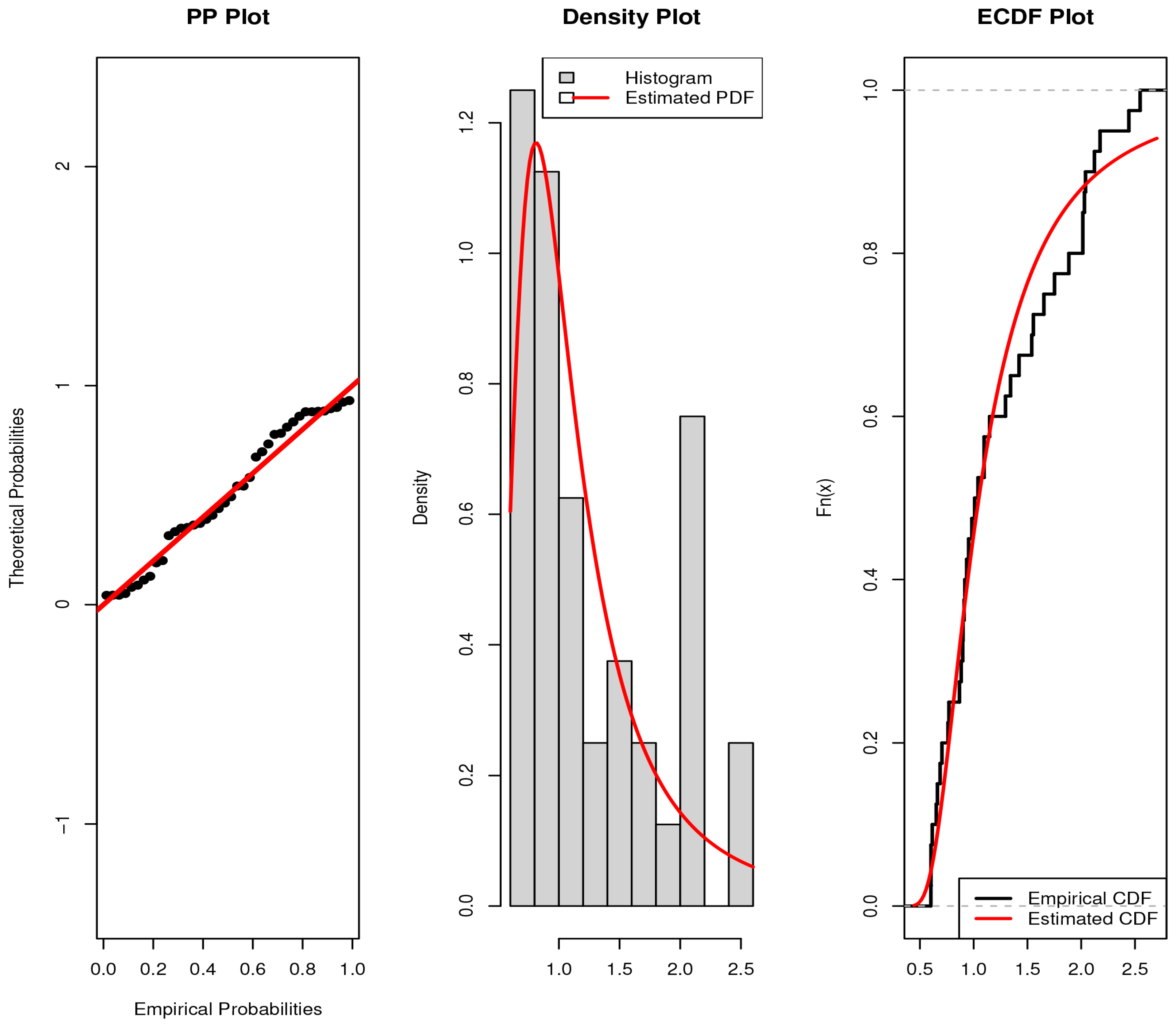 34]. Each of these models provides a different degree of flexibility in modeling positively skewed data, which allows us to assess the robustness and accuracy of the I-PLD fit. These models were fitted to the same real dataset, and their performances were evaluated using several goodness-of-fit criteria, including the Akaike Information Criterion (AIC), Corrected AIC (CAIC), Bayesian Information Criterion (BIC), Hannan–Quinn Information Criterion (HQIC), and the Kolmogorov–Smirnov (K–S) test.