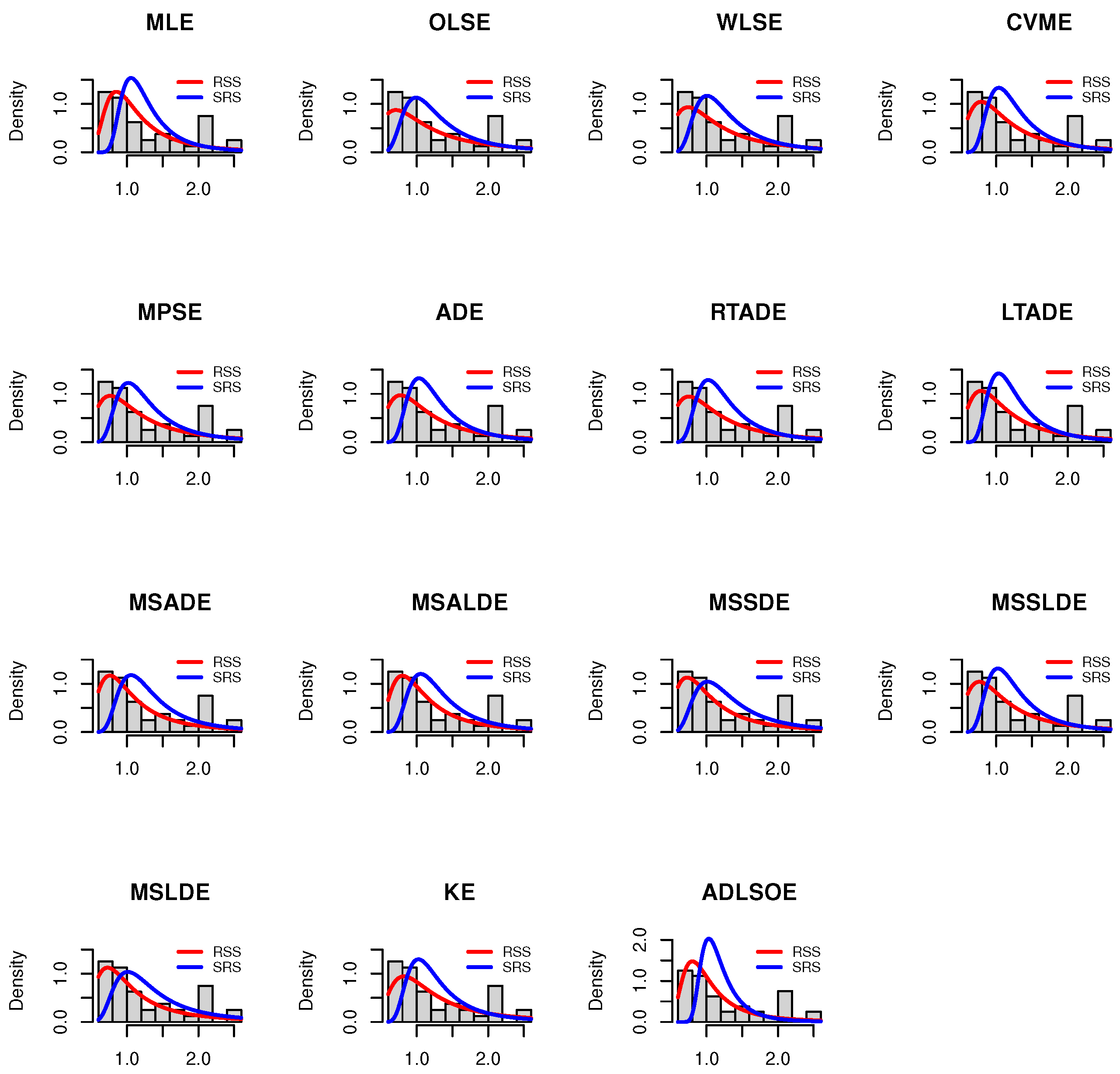 To comprehensively examine the superiority of ranked set sampling over SRS across different estimation methods, an SRS sample of size 12 was chosen for comparability, while an RSS scheme was designed with a set size of 3 and four cycles to maintain the same total sample size. Assuming a perfect sampling design, an extensive evaluation was carried out using several goodness-of-fit statistics to assess the performance and reliability of each sampling approach. Specifically, we employed the Anderson–Darling test