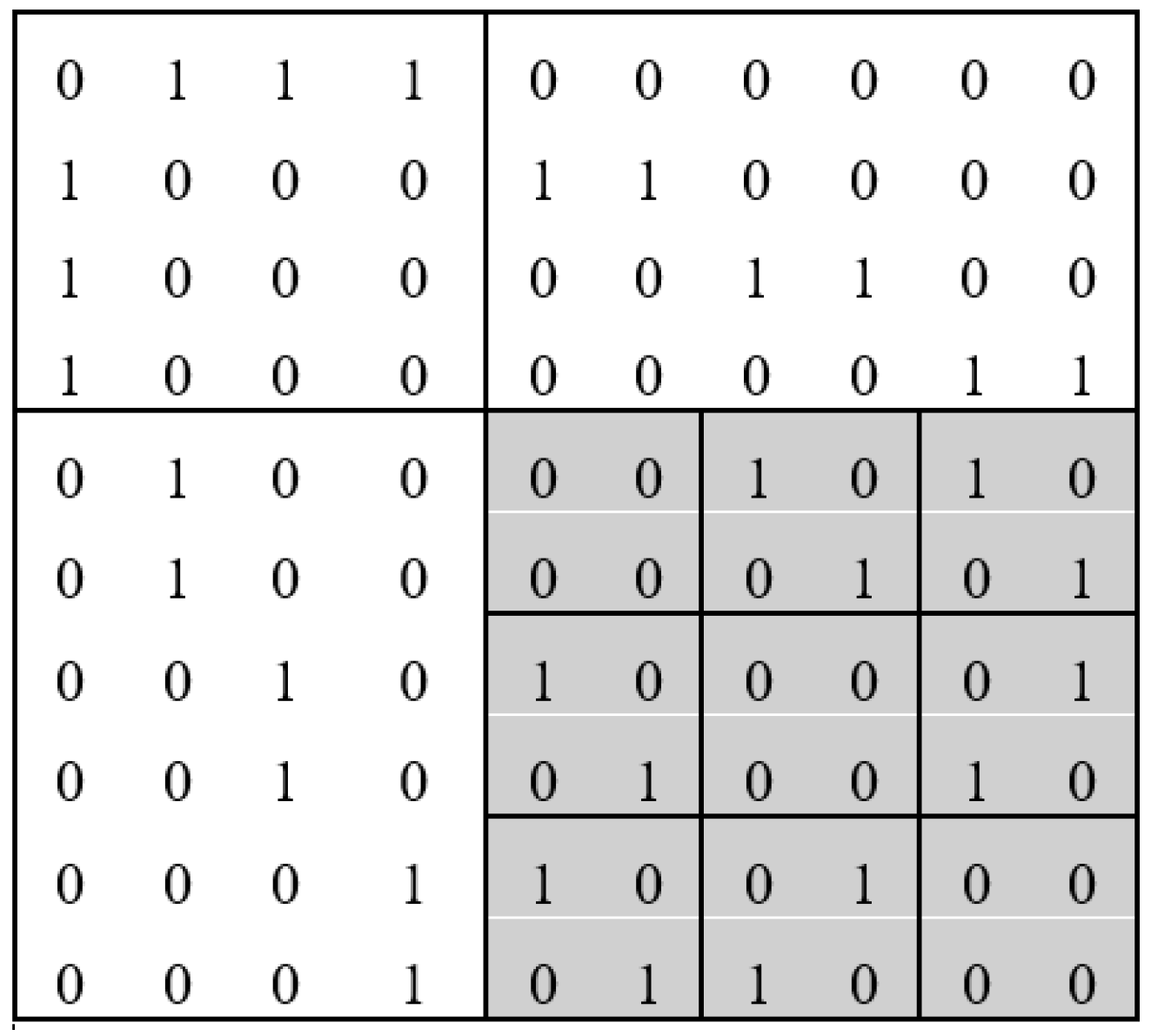 Figure 1 presents the adjacency matrix of the Peterson graph (a Moore graph with degree 3 and diameter 2) for a better understanding. The shaded area of the matrix represents the block matrix