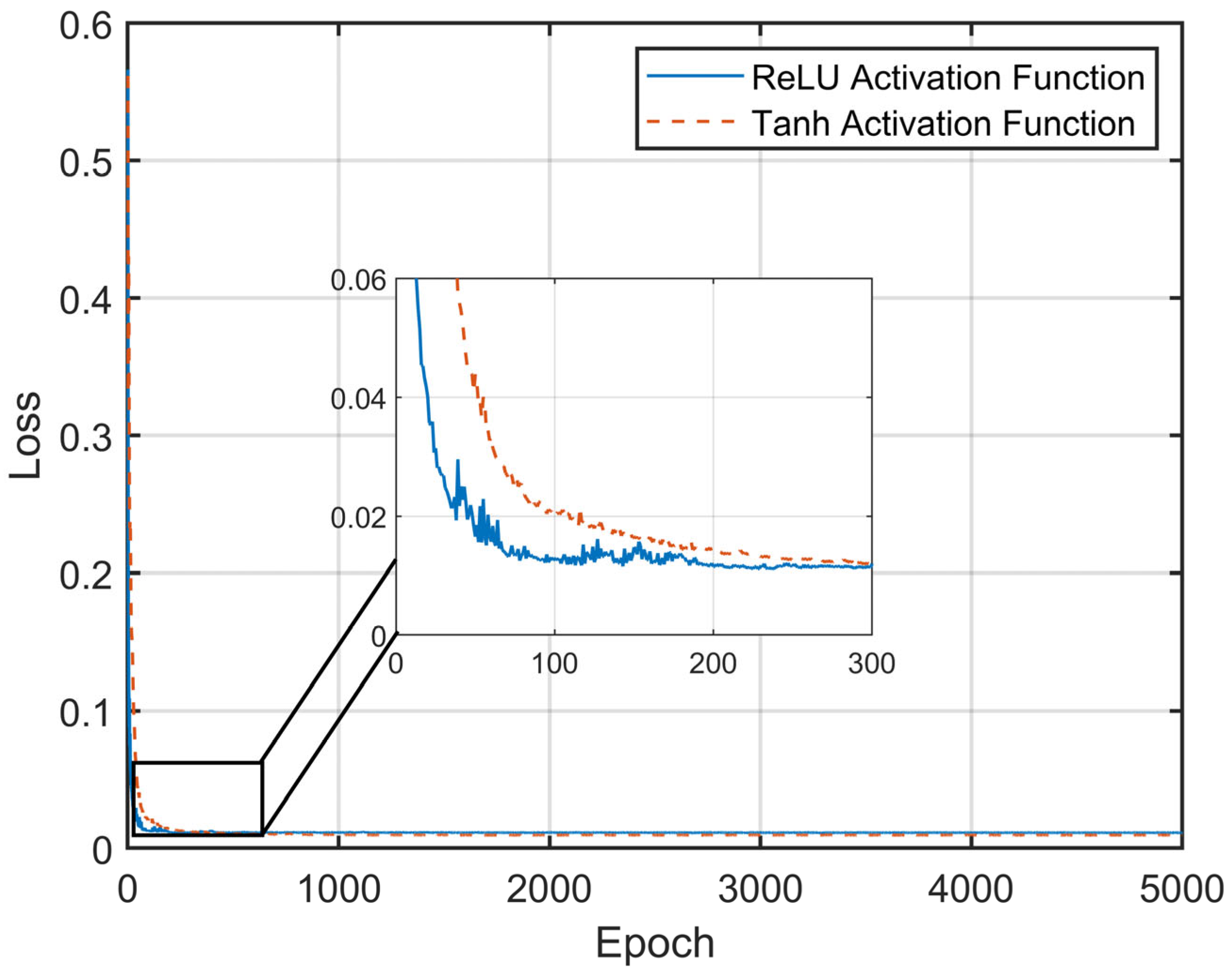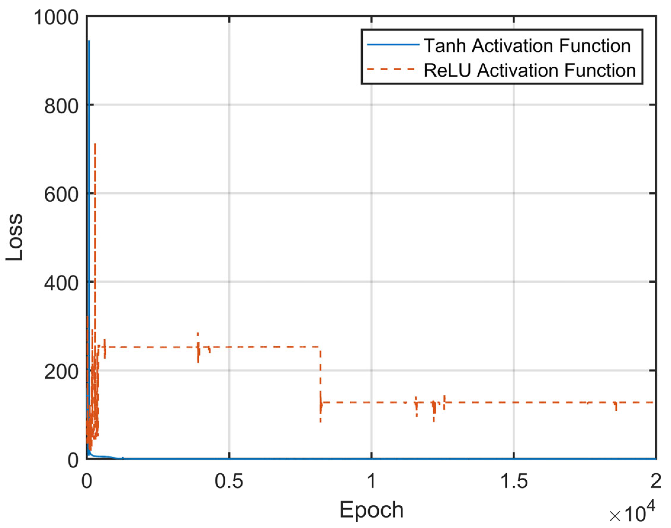 The comparison reveals that, under the same number of training epochs, the loss values obtained using the tanh activation function are significantly lower than those with ReLU. Moreover, the smoothness and stability of the solutions obtained with tanh are more accurate in the two-dimensional setting. This is because the tanh activation function is better suited to handling complex boundary conditions and ensuring the continuity of solutions in multidimensional spaces. In contrast, ReLU tends to produce discontinuous gradients when dealing with high-dimensional problems, leading to abnormal fluctuations in the loss values and difficulty in converging to the optimal solution.