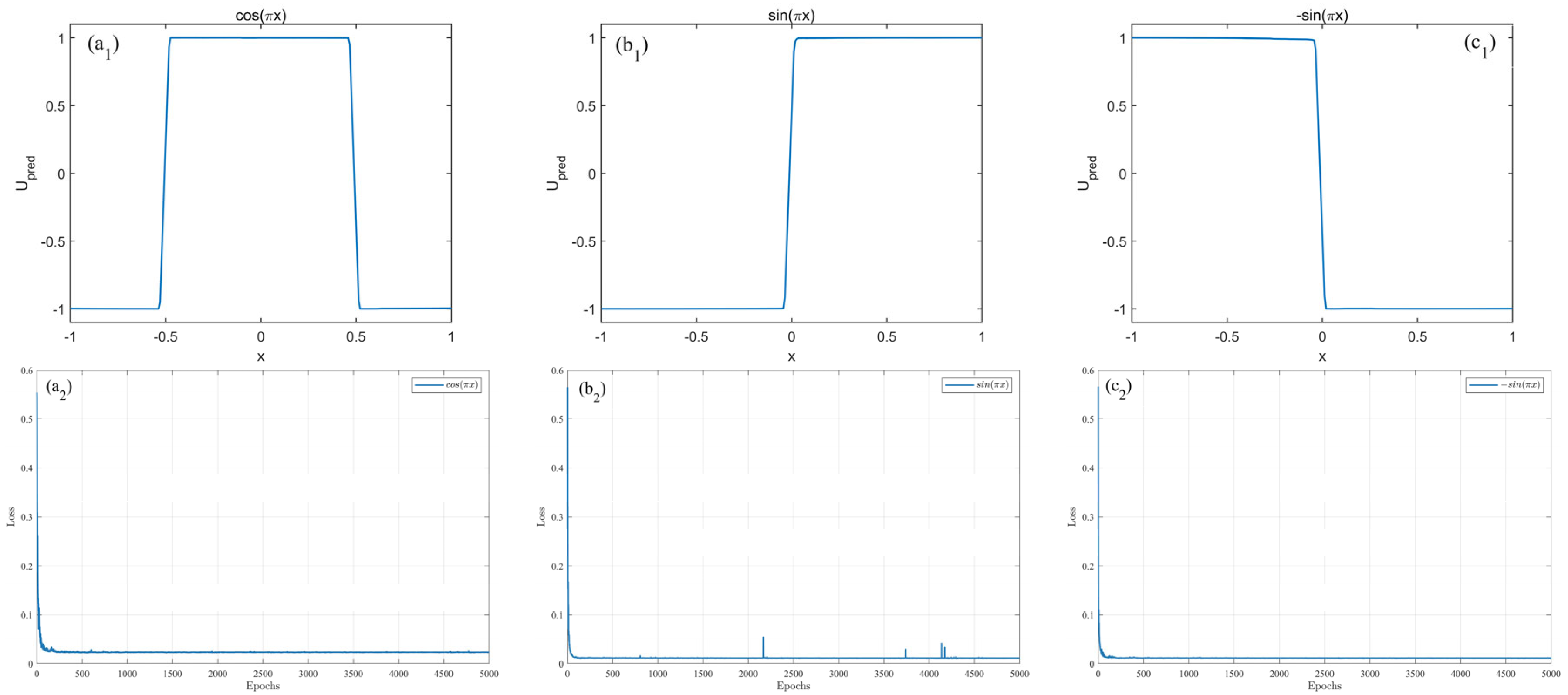 From the results, it can be observed that the loss function converges rapidly, and the system ultimately reaches a steady-state phase-separated configuration. In the spatial domain, the solution converges to , which aligns perfectly with theoretical predictions. Specifically, for all three initial conditions (, , ), the solutions exhibit distinct phase separation characteristics: clear interfaces form within the spatial domain, dividing it into two regions—one where approaches , and the other where approaches .