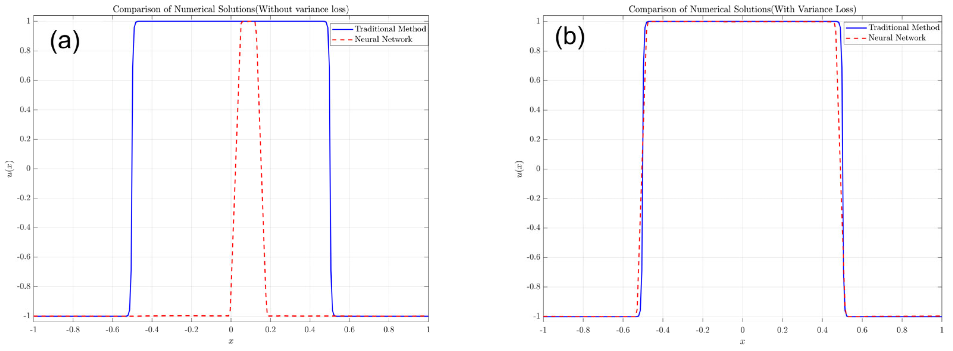 Figure 5 provides a visual comparison of the solutions obtained with and without variance loss for the initial condition cos(πx). The solid blue line represents the FDM solution, while the red dashed line represent solutions obtained with and without variance loss. The results demonstrate that incorporating variance loss leads to solutions that more closely align with FDM. Without variance loss, the neural network tends to produce solutions with larger deviations from the expected physical behavior, particularly near the interface regions where x ≈ ±0.5. The addition of variance loss effectively constrains the solution space, resulting in more physically consistent results that better capture the interface dynamics of the Allen-Cahn equation.