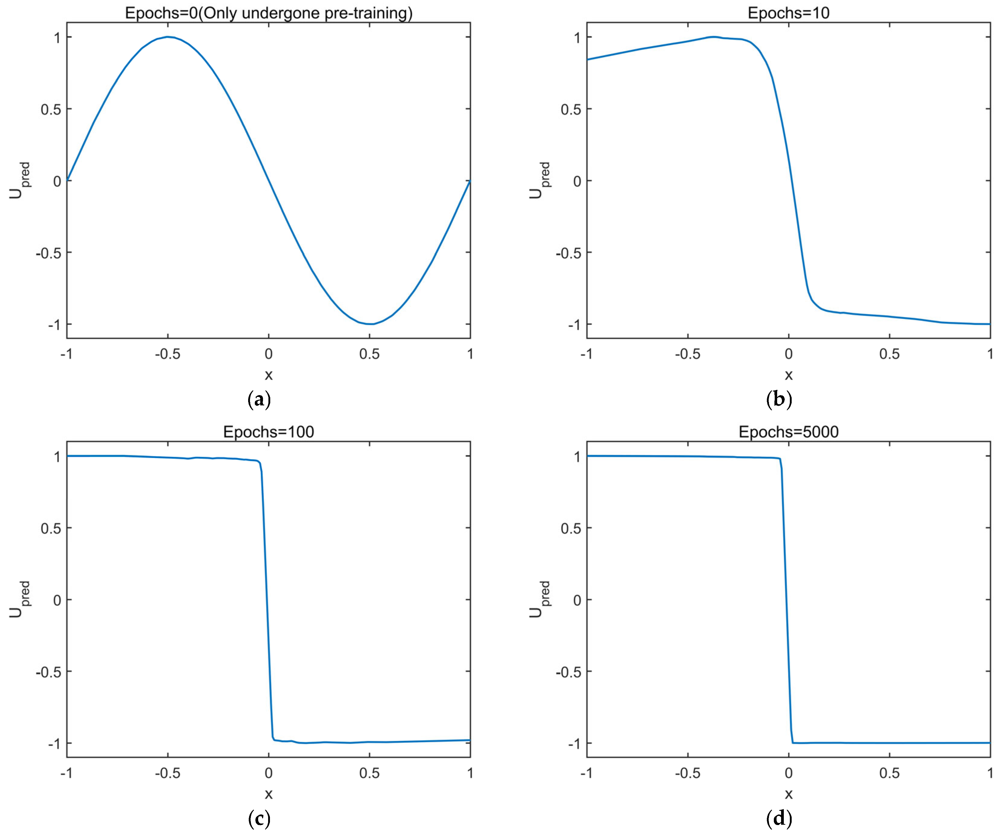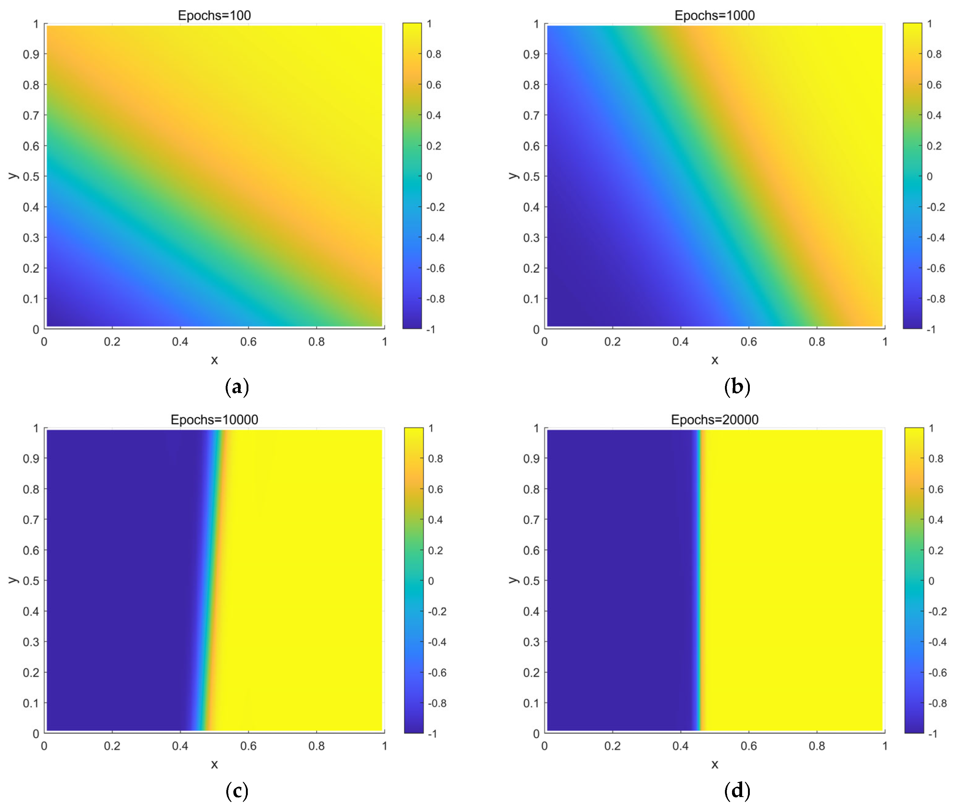Figure 9 shows the predicted solutions at different training epochs (100, 1000, 10,000, and 20,000).