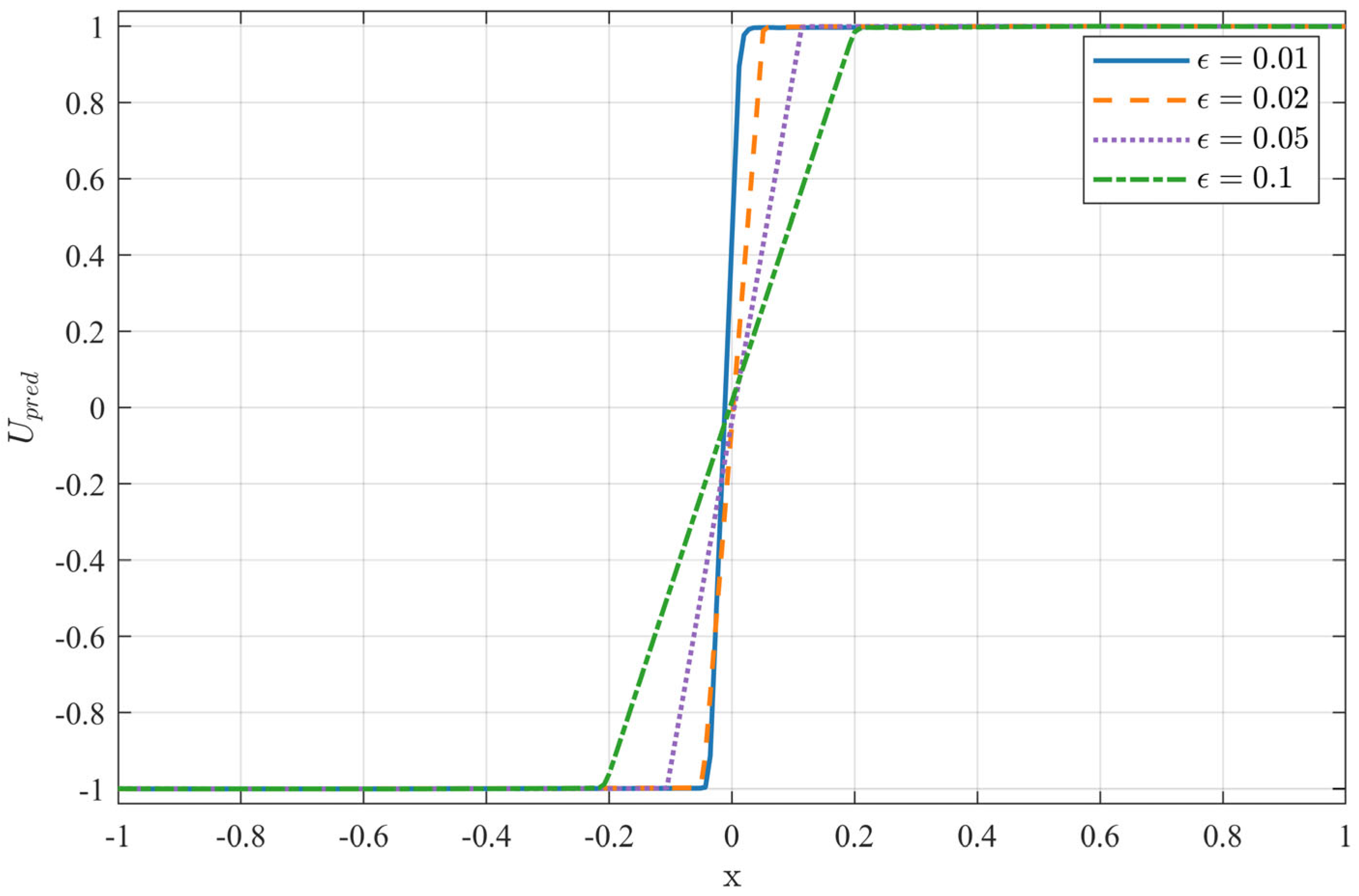 In the context of solving the Allen-Cahn equation by minimizing the energy functional using neural networks, it is crucial to understand the influence of parameter on the interface width and phase separation behavior. The Allen-Cahn equation is widely applied in modeling phase separation and interface evolution, where , governs the sharpness of the interface and the system’s dynamic properties. By varying the value of , we can gain deeper insights into its role in energy functional minimization.