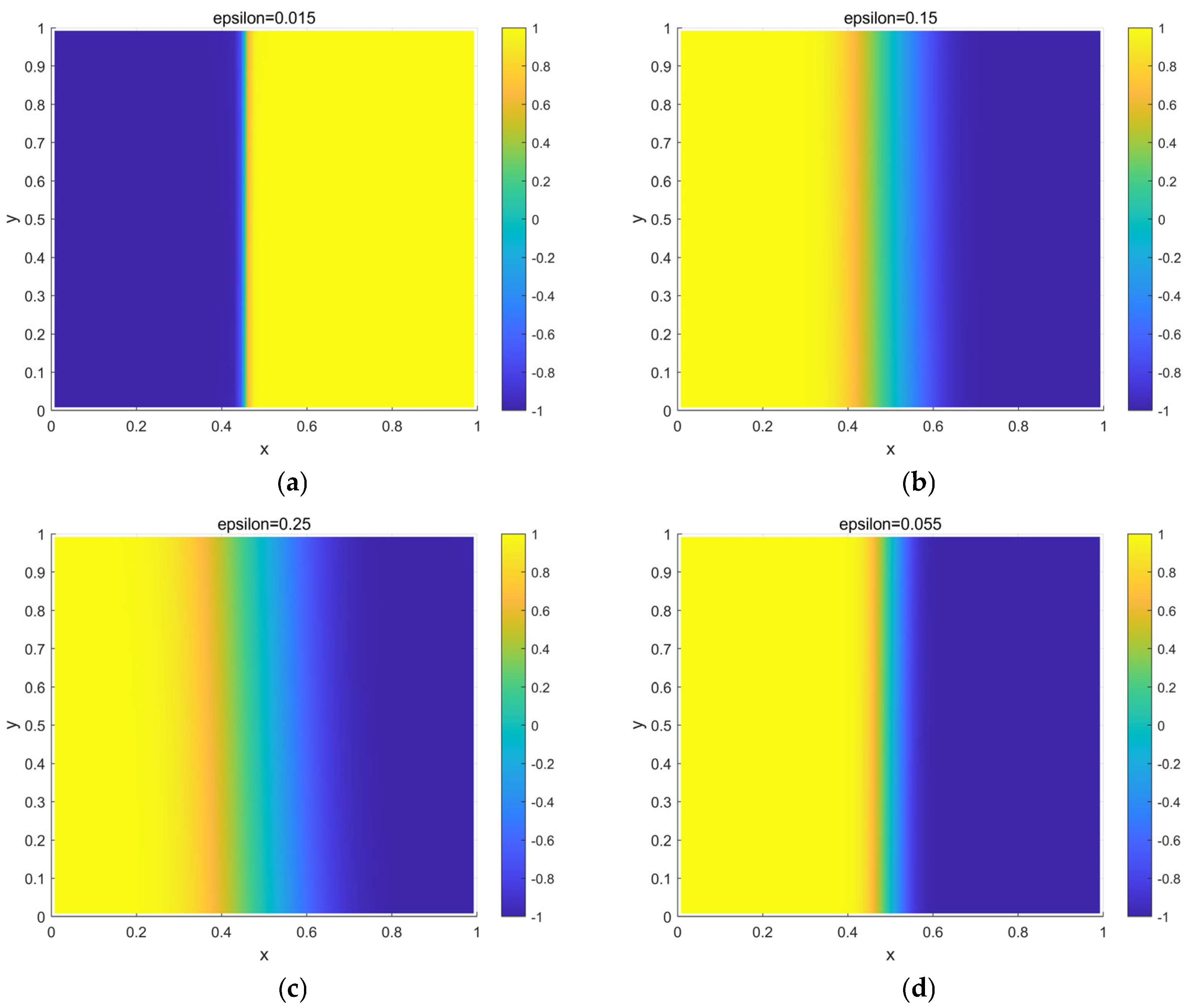 The results reveal that as decreases, the interface becomes steeper, and the transition region narrows, exhibiting more pronounced phase separation. This is because a smaller ϵ corresponds to a higher energy penalty, causing the system to transition rapidly into stable phases. From an energetic perspective, the double-well potential term (u2 − 1)2 ensures that u = ±1 are the system’s energy minima, explaining the mechanism by which solutions tend toward these two stable states. Meanwhile, the gradient term ϵ2(du/dx)2 determines the width of the interface. Our numerical results clearly illustrate this competition between the two energy terms.