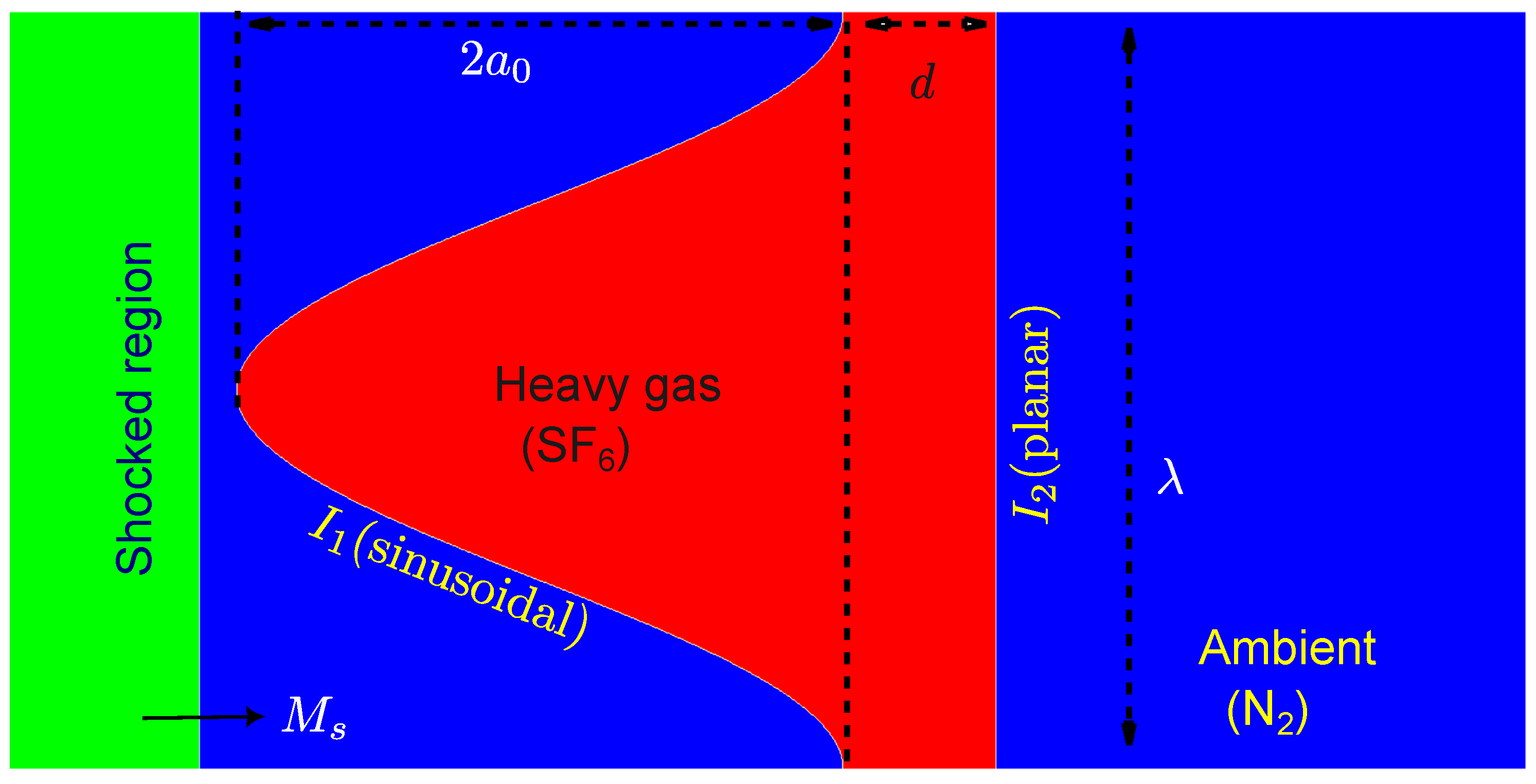 - Haas, J.F.; Sturtevant, B. Interaction of weak shock waves with cylindrical and spherical gas inhomogeneitiesn. J. Fluid Mech. 1987, 181, 41–76. [Google Scholar] [CrossRef]