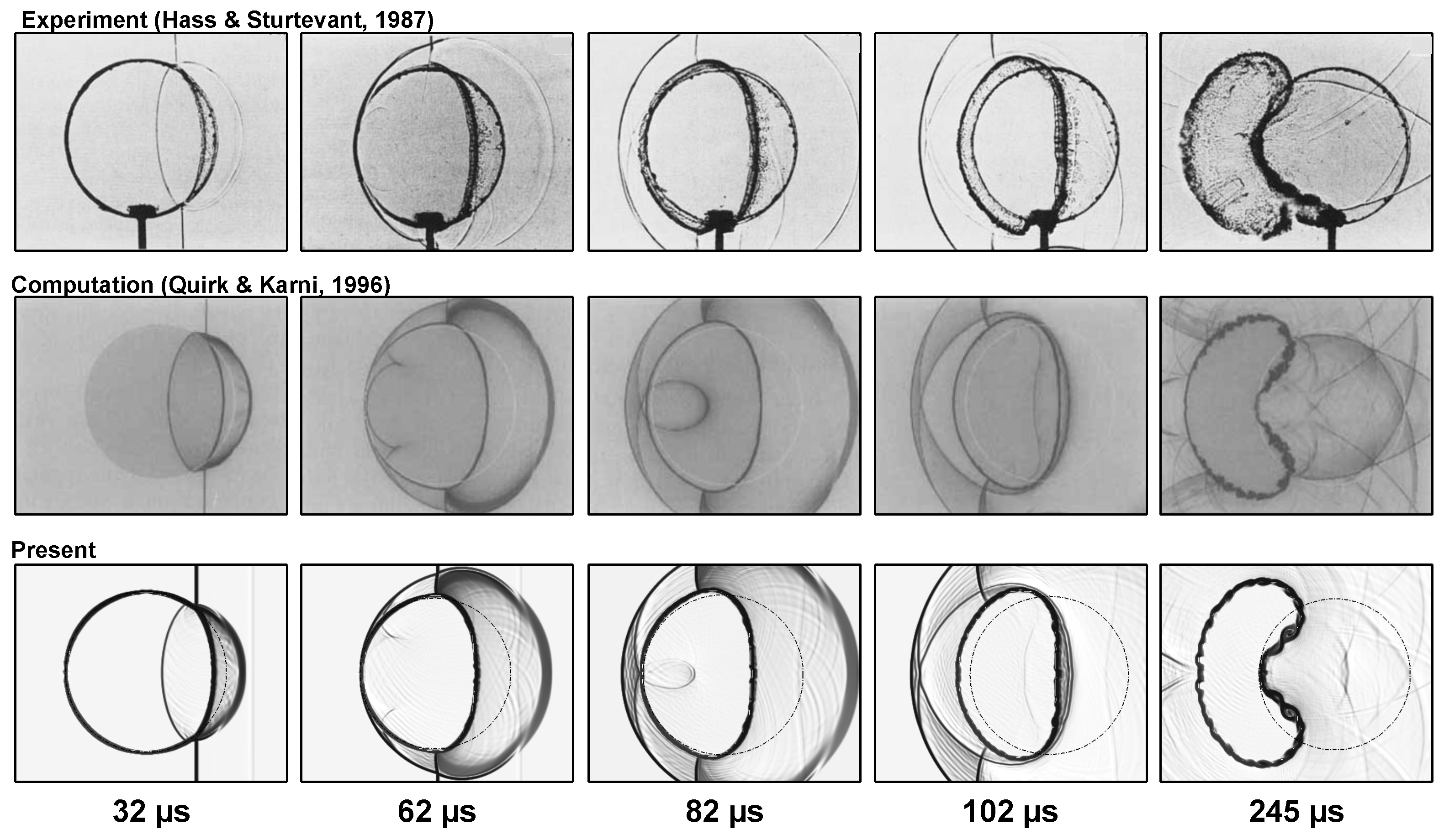 - Quirk, J.J.; Karni, S. On the dynamics of a shock–bubble interaction. J. Fluid Mech. 1996, 318, 129–163. [Google Scholar] [CrossRef]