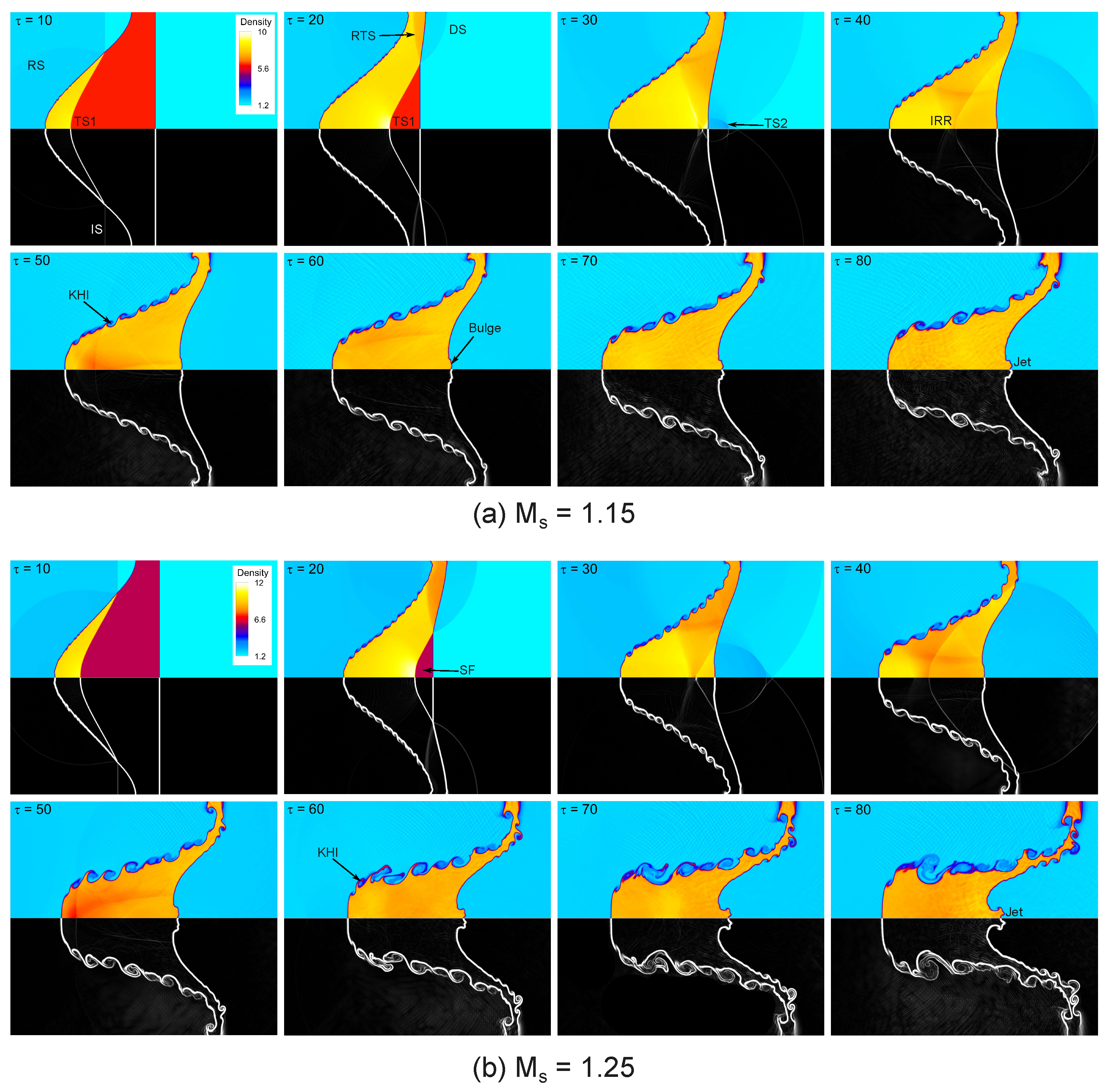 - Singh, S.; Battiato, M. Numerical investigation of shock Mach number effects on Richtmyer–Meshkov instability in a heavy square bubble. Phys. D Nonlinear Phenom. 2023, 453, 133844. [Google Scholar] [CrossRef]