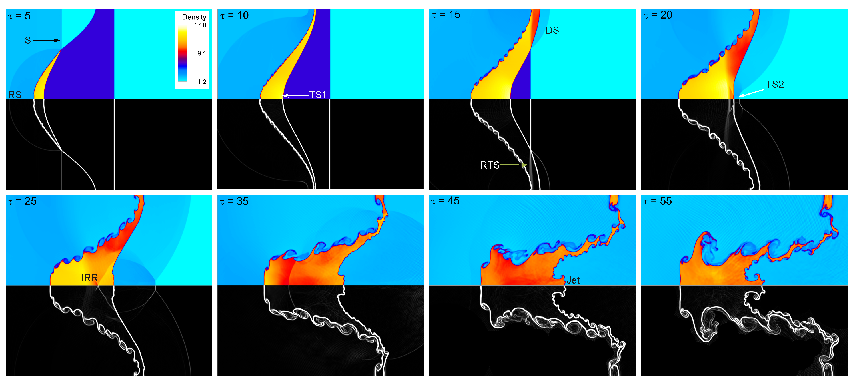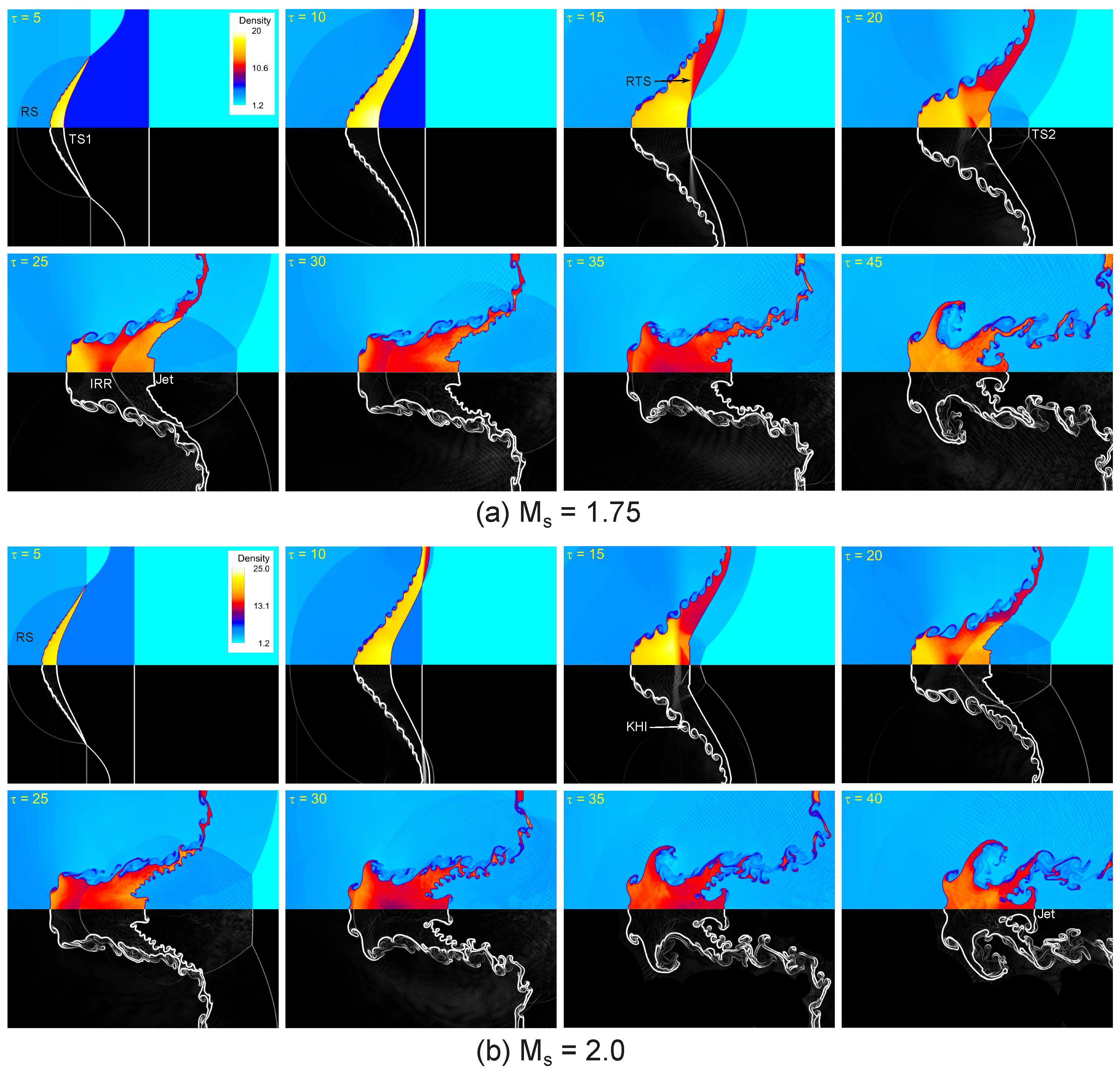 - Chen, Y.; Jin, T.; Zou, L. Numerical study of Richtmyer–Meshkov instability in shocked composite curtain under different initial conditions. Phy. Fluids 2025, 37, 034106. [Google Scholar] [CrossRef]