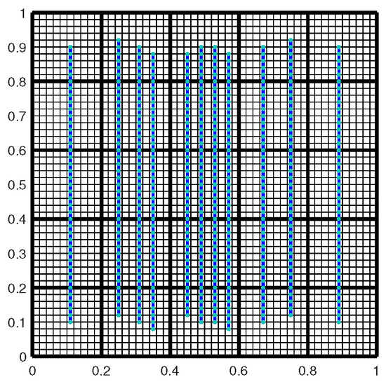 The fracture configuration fracture 1 in Example 1. The blue lines indicate fractures; the light green dots indicate grid nodes of the fractures.