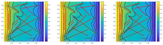 We test two different fracture configurations: Fracture 2 and Fracture 3, as shown in Figure 2. In Fracture 2, the fractures are intersected with each other, having different orientations, directions and lengths, and some of them are completely immersed, partially immersed or not immersed in one coarse cell. In Fracture 3, the fractures are curvilinear and also intersected with each other. The boundary condition is the same as (72). The matrix permeability and fracture permeability are, respectively, taken as and . We use 3 initial basis functions per coarse cell for the online enrichment, and the convergence history is shown in Table 5. The relative errors reduce rapidly for these two fracture configurations. Figure 3 and Figure 4 present comparisons for the pressure and contours between the fine-grid solution and multiscale solutions with 4 and 5 basis functions per coarse cell (including 3 initial basis functions), and we find that multiscale solutions supply good approximations after the addition of two online basis functions per coarse cell.