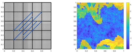 The fracture configuration Fracture 4 (left) and the matrix permeability (right, logarithmic scale) in Example 3. In the left graph, the blue lines indicate fractures; the light green dots indicate grid nodes of the fractures.