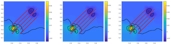 (Example 2) The fine-grid solution (left), multiscale solutions with 4 (middle) and 5 (right) basis functions per coarse cell of Fracture 2.