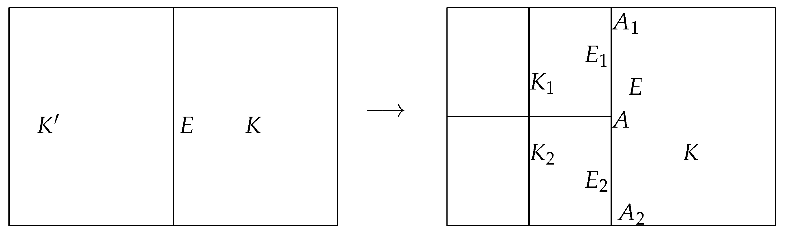 (Left) Regular interior edge () connecting two associated elements (K and ); (Right) Hanging node A, along with its neighboring regular nodes ( and ) and its irregular interior edge () subdivided into two son edges (), where each son edge corresponds to a single element ( or ).
