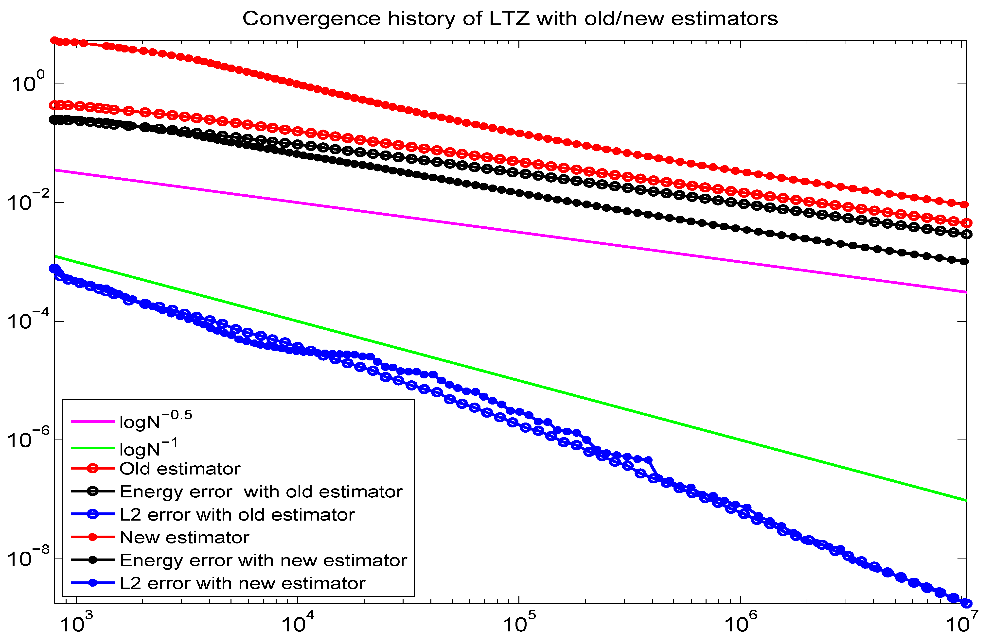 with the LTZ element method using the old estimator and new estimator. Although both adaptive methods converge with the optimal rate, energy norm errors of the adaptive LTZ element method with a new estimator are smaller than those of the old estimator under the same scale.