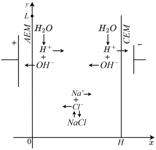 Scheme of the desalination channel and the simulated phenomena, the Ox axis is directed across the channel, at x = 0, the AEM is located, and at x = H-CEM, the Oy axis is directed along the channel, y = 0 is the entrance to the channel, y = L is the exit from the channel. A certain potential jump is applied to the system. OH− ions formed near the anion exchange membrane are transferred through this membrane and do not participate in further transfer processes, H+ ions move deeper into the solution. A similar process occurs near the cation exchange membrane, and OH− go towards H+ and recombine with them in the depth of the solution.