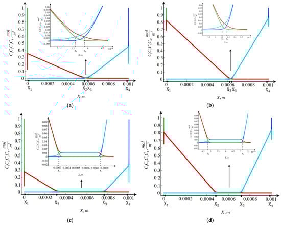 As shown in Figure 2a,b, the qualitative behavior of the concentrations of all four ion species for and is similar. Specifically, near the ion-exchange membranes, boundary layers (, ) are observed where the concentrations of chloride ions and hydrogen ions at the anion-exchange membrane (), as well as sodium ions and hydroxide ions at the cation-exchange membrane (), vary at an exponential rate. Beyond these layers, there are relatively large regions adjacent to the boundaries (, ) where the concentrations of the above-mentioned ions change linearly or are nearly zero. Moreover, the concentrations of and match with high accuracy, as do those of and . In the central part of the channel, there exists a region with nearly constant concentration distributions, the values of which are practically independent of .