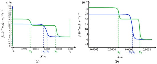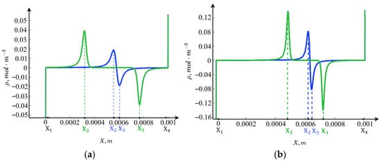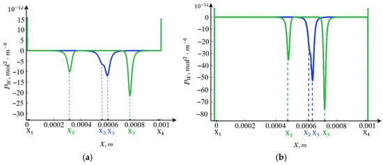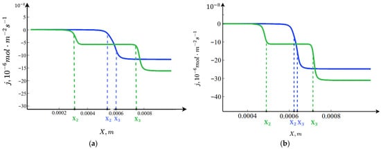 Figure 4 shows that in the regions of spatial charge, within the boundary layers near the ion-exchange membranes, intense water molecule dissociation occurs, as the electric field strength in these regions reaches very high values. Moreover, for , water dissociation is more intense than for . In region , the ions are completely transported through the anion-exchange membrane (boundary condition 19a), so their concentration is practically zero. At the same time, the concentration of ions rapidly increases. The concentration of ions decreases exponentially from , while the concentration of (formula) remains practically zero.