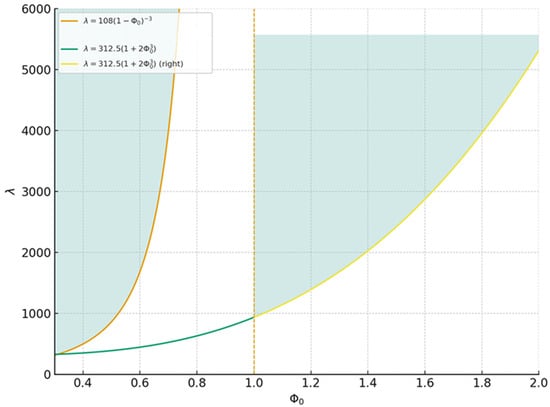- The results in [8] were restricted to the interval . Consequently, this results fails to provide any oscillation results once reaches or exceeds unity. In contrast, our formulation remains valid up to (green area enclosed during in Figure 1), where the cubic condition dominates and ensures the existence of feasible solutions. This extended validity represents a clear improvement and demonstrates the robustness of our approach.
