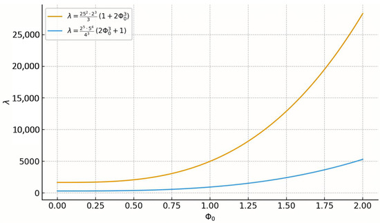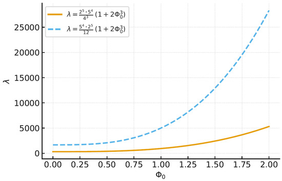- Figure 2 illustrates a direct comparison between Theorem 1 (solid yellow curve) and Theorem 3 (dashed blue curve). It is evident that Theorem 1 consistently provides smaller values of λ across the examined range of , reflecting a tighter and more efficient bound. In contrast, Theorem 3 grows significantly faster. That is Theorem 1 offers a stronger and more reliable characterization of the oscillatory condition.