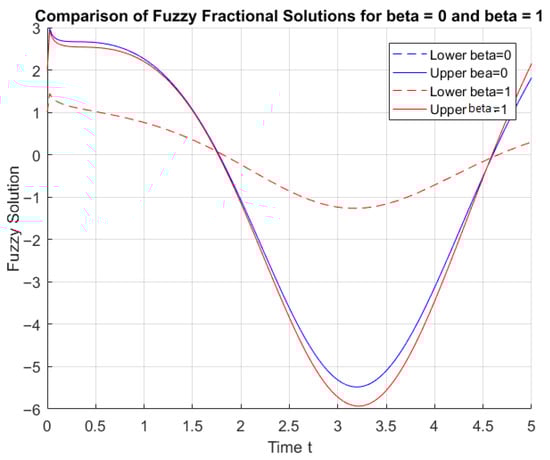 The numerical results in Figure 3 demonstrate that the fuzzy solution for the Hilfer-type fractional differential equation with order displays dynamic behavior under two distinct settings of the type parameter; namely, and . The solution—represented as a fuzzy interval bounded by its lower and upper routes—was computed using the integral form with cosine family operators and a convolution kernel defined by a probability density function. For , which corresponds to the Riemann–Liouville-type Hilfer derivative, the solution develops more quickly and has a wider range in its fuzzy limits, indicating higher sensitivity to the initial conditions and greater propagation of uncertainty. This is to be expected, as the Riemann–Liouville derivative gives greater weight to the system’s prior conduct. In contrast, in the situation where , the Caputo-type behavior leads to smoother dynamics and a shorter fuzzy range. This implies that the influence of the initial data deteriorates more gradually and that the solution behaves more consistently over time. Moreover, the apparent oscillations in the solution are caused by the cosine family , which regulates the structure of the underlying evolution system. These oscillations are superimposed on top of a generally increasing trend due to the non-linearity in the source term and the interaction with the fractional kernel.