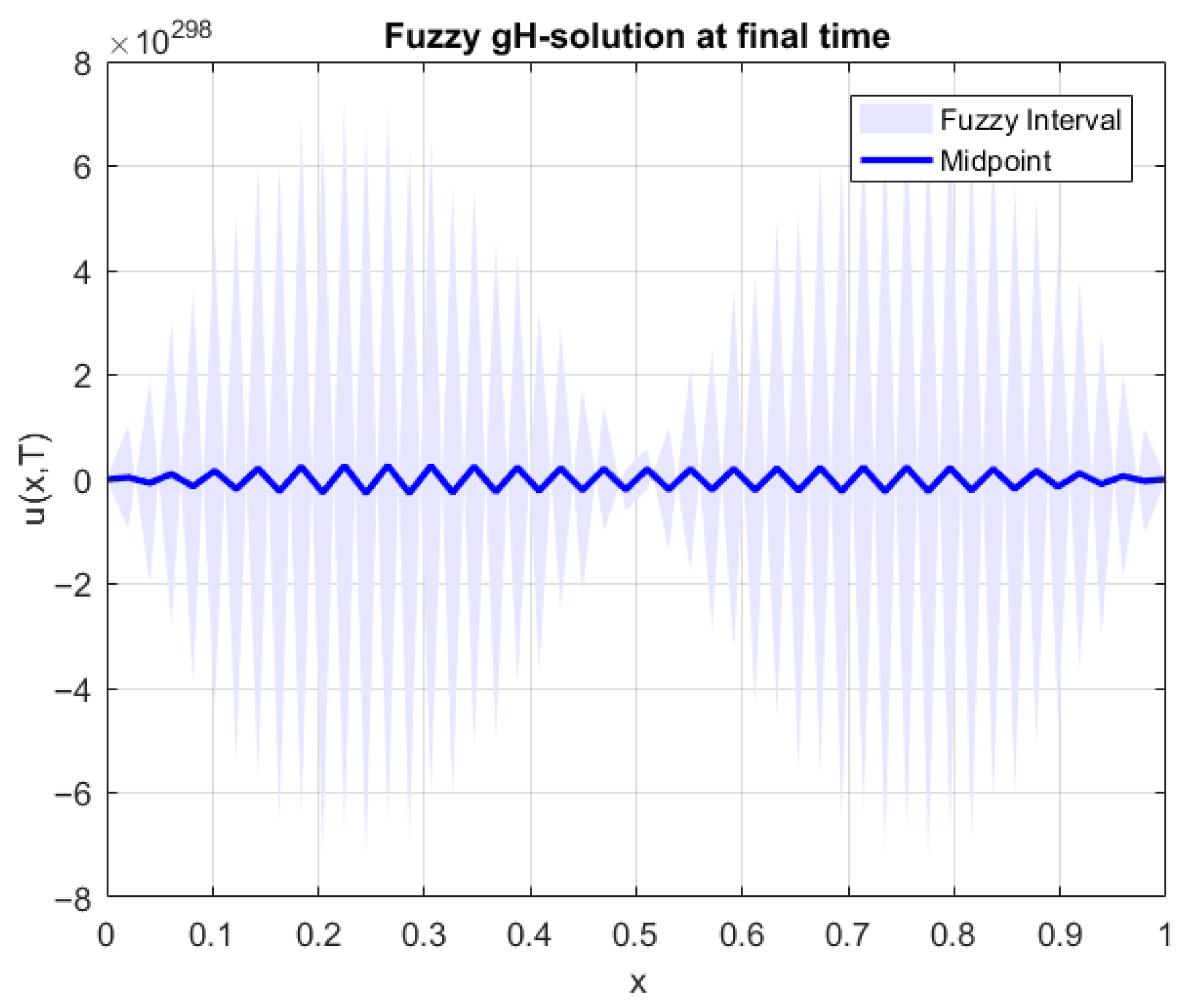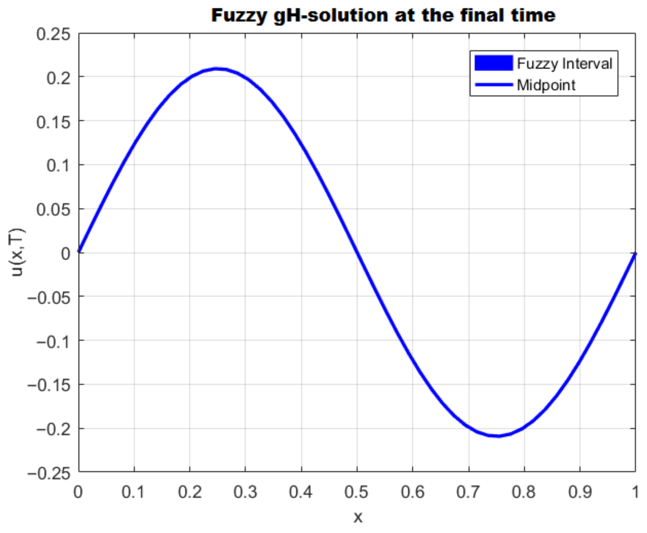 The numerical distribution of the fuzzy -solution at the final time T is shown in Figure 2. The answer calculated using the generalized Hukuhara framework is shown as a solid line, representing the fuzzy solution’s midpoint, while the shaded fuzzy interval shows the fuzzy function’s lower and upper limits. There is noticeable oscillatory behavior in the picture, which symmetrically declines towards the borders and is especially focused near the mid-domain. While the breadth of the fuzzy interval rises dramatically in certain locations—particularly near and —the midpoint solution stays regular, suggesting increasing uncertainty and unpredictability in the fuzzy state.
