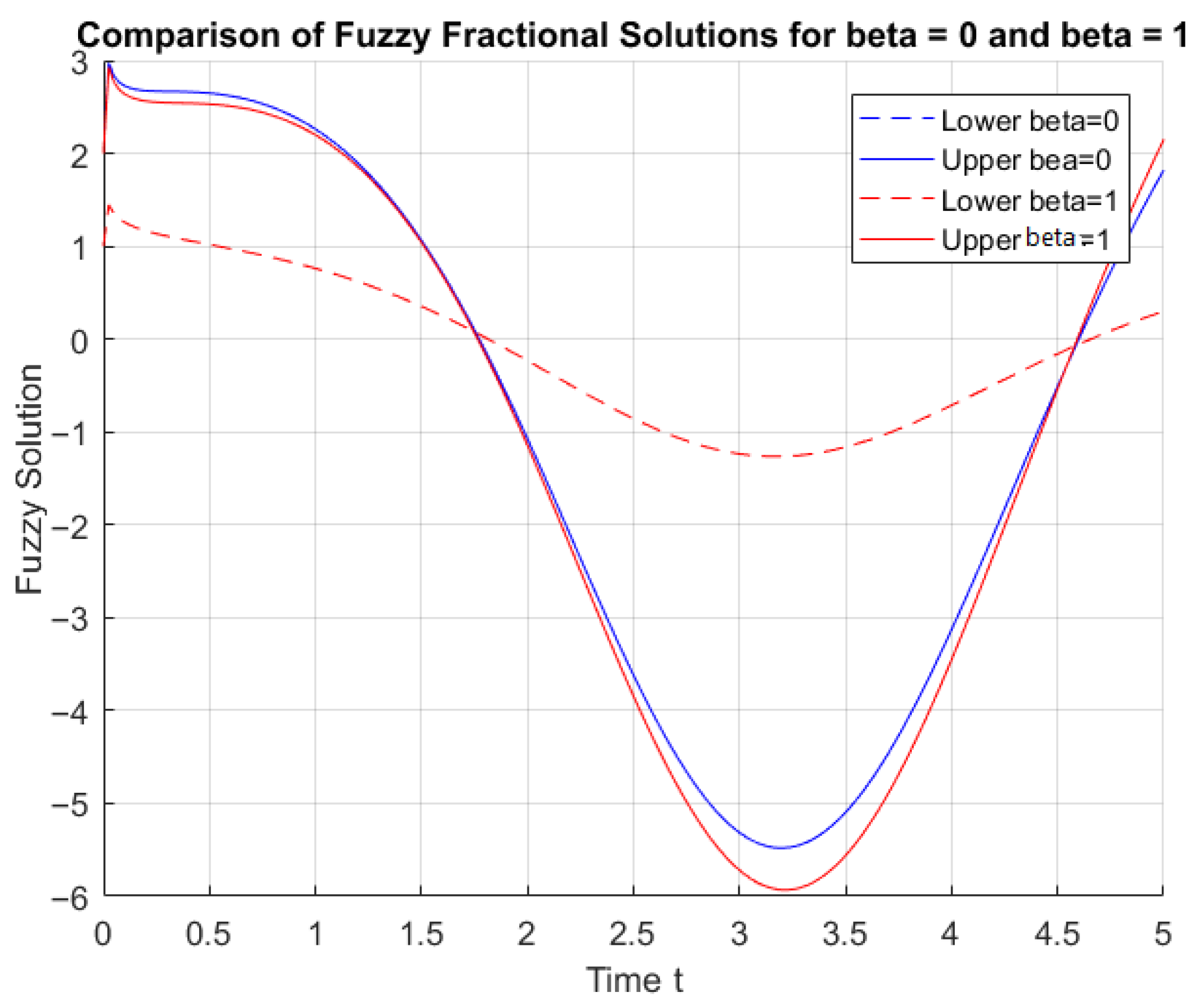 Overall, the comparison reveals that the qualitative behavior of the fuzzy fractional solution is significantly influenced by the type parameter . The choice between and when modelling uncertain dynamical systems in real-world scenarios should be based on the required sensitivity and memory properties.