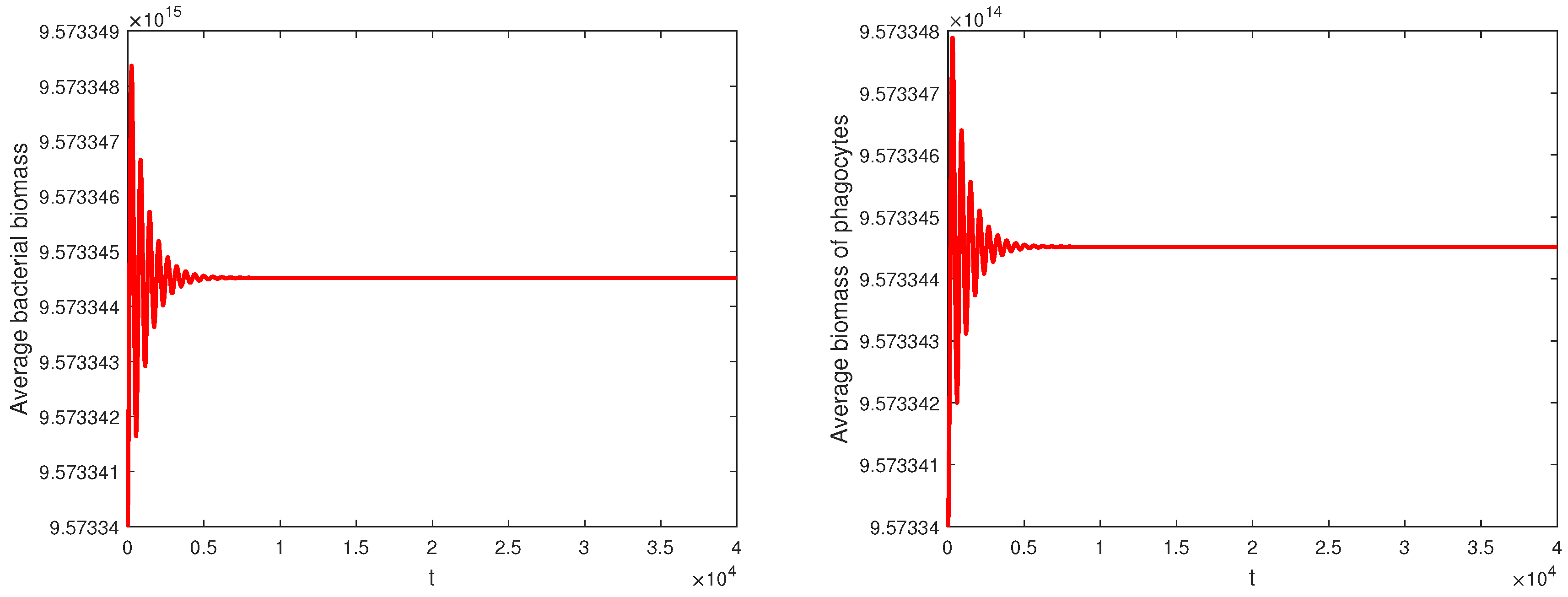 Figure 8 demonstrates that when the phagocytosis death rate increases, the average bacterial biomass rises, and the time for bacteria to stabilize shortens. However, despite the rapid stabilization of bacteria, the infection is not effectively cleared. At last,
