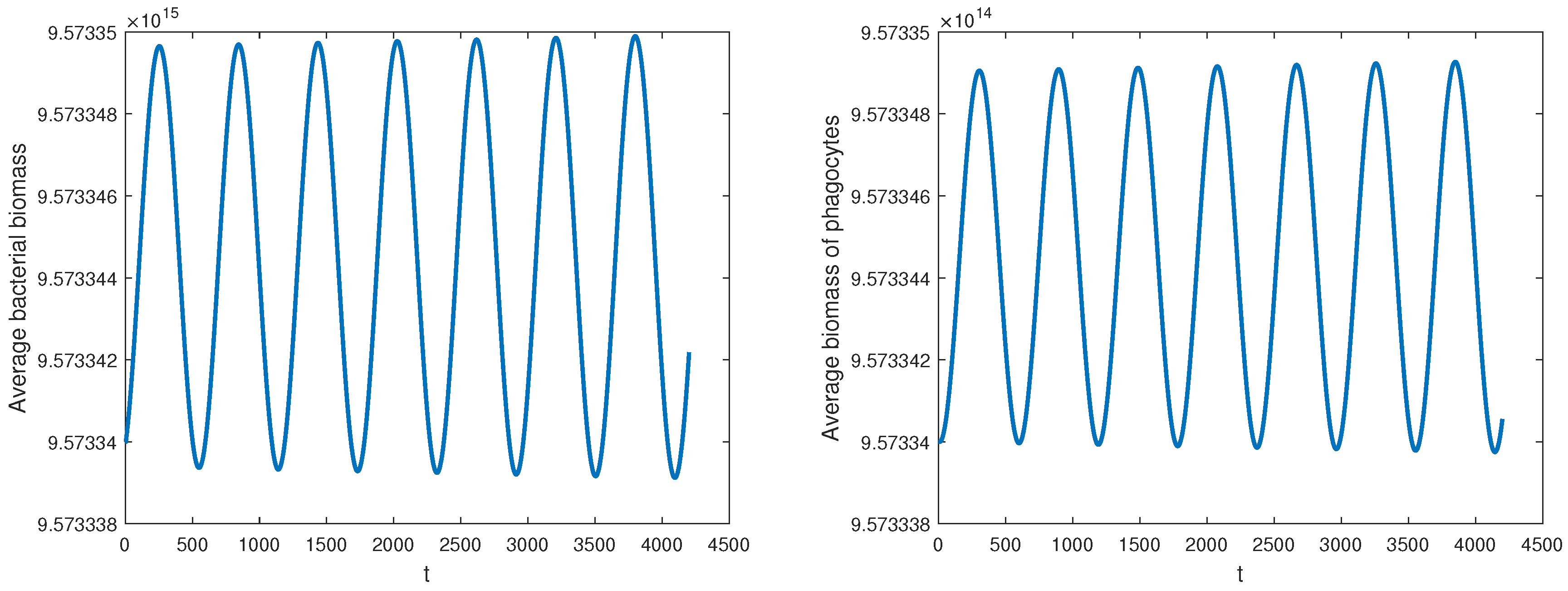 Figure 9 reveals that an increase in the rate of bacterial increase leads to higher average bacterial biomass and a longer stabilization time. The persistent stimulation of the immune system by bacteria prolongs the duration of infection.